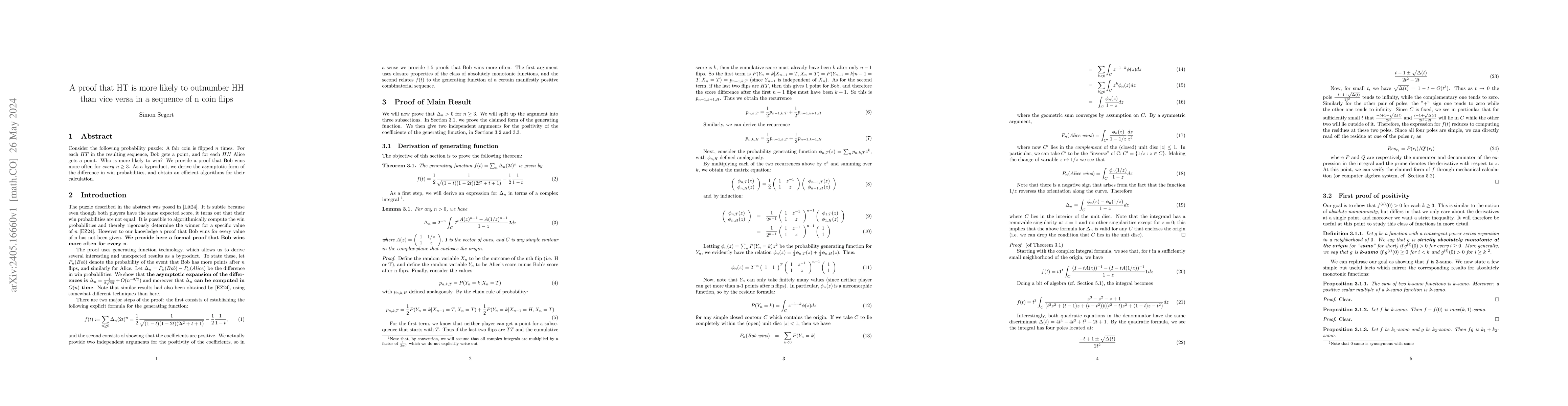 Summary: The paper proves that, for a fair coin flipped n times (n>=3), Bob, who scores for each HT sequence, is more likely to outscore Alice, who scores for each HH sequence. Additionally, it derives the asymptotic difference in their win probabilities and presents an efficient algorithm to compute these probabilities.