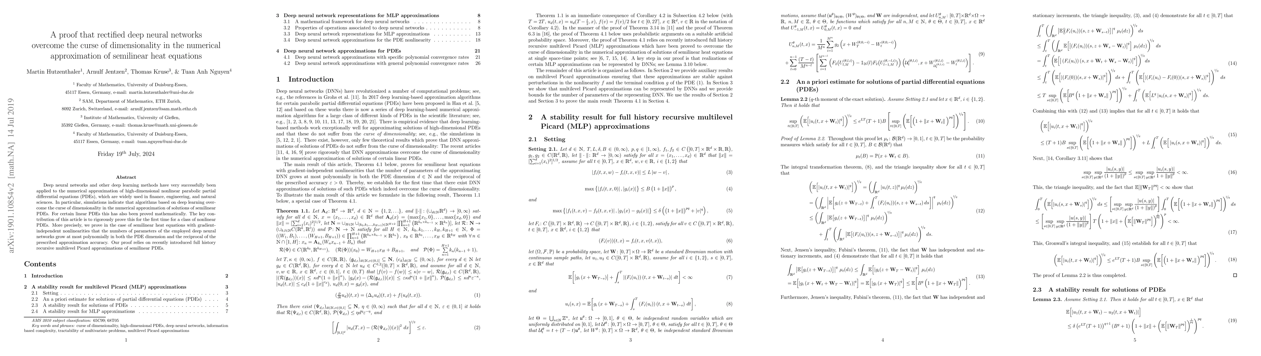 This paper rigorously proves that rectified deep neural networks can overcome the curse of dimensionality in approximating semilinear heat equations, showing that the number of parameters grows at most polynomially with the PDE dimension and the desired accuracy. The proof leverages multilevel Picard approximations of semilinear PDEs.
