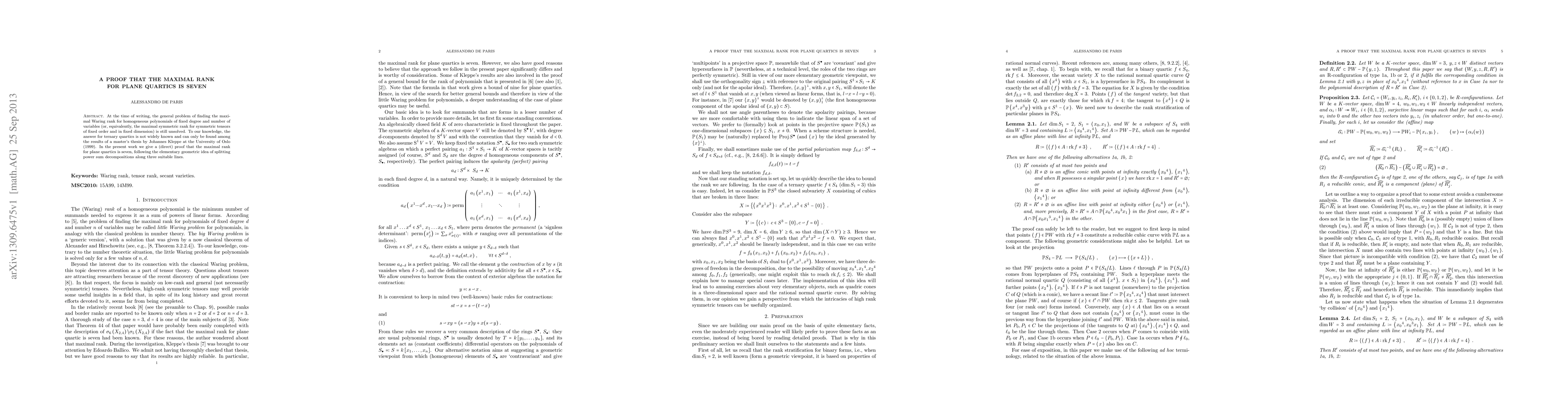 This research paper provides a direct proof that the maximal rank for plane quartics is seven, solving a long-standing problem in algebraic geometry.