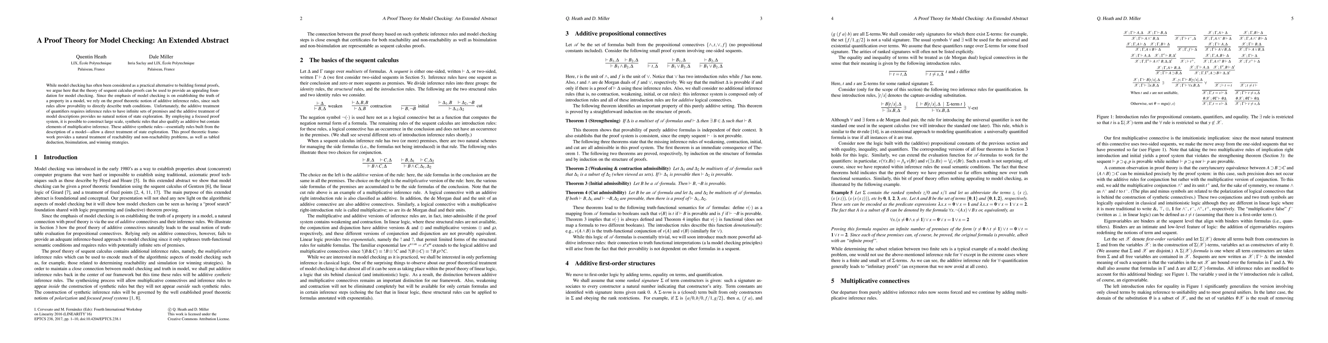 This research paper proposes a proof theory framework for model checking that uses additive inference rules to establish truth conditions directly, allowing for efficient treatment of state exploration problems like reachability and bisimulation.