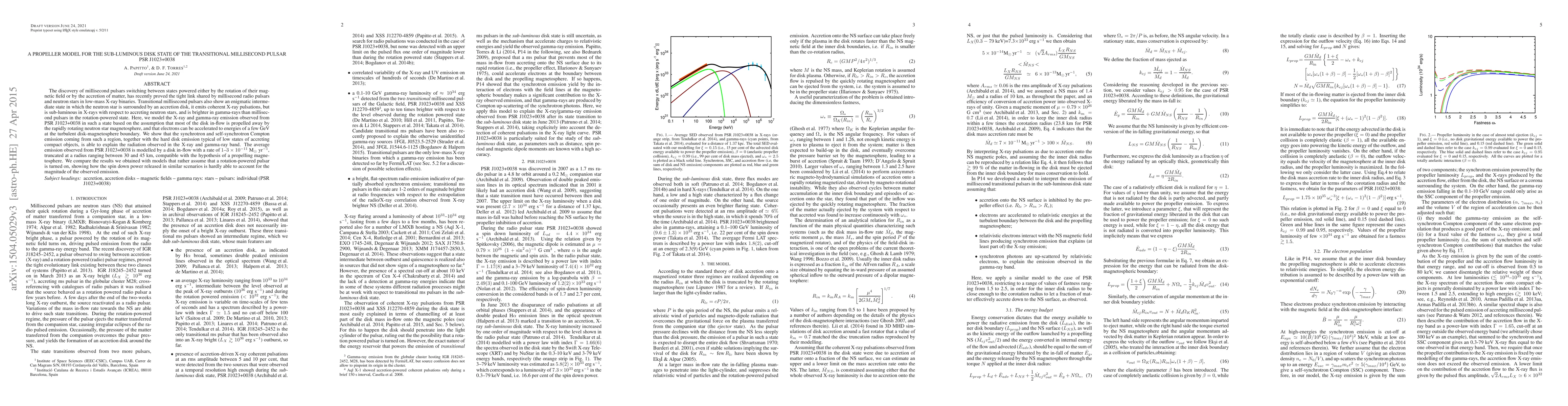 The study models X-ray and gamma-ray emission from transitional millisecond pulsar PSR J1023+0038 using a propeller model, suggesting that electrons can be accelerated to high energies at the disk-magnetosphere boundary.
