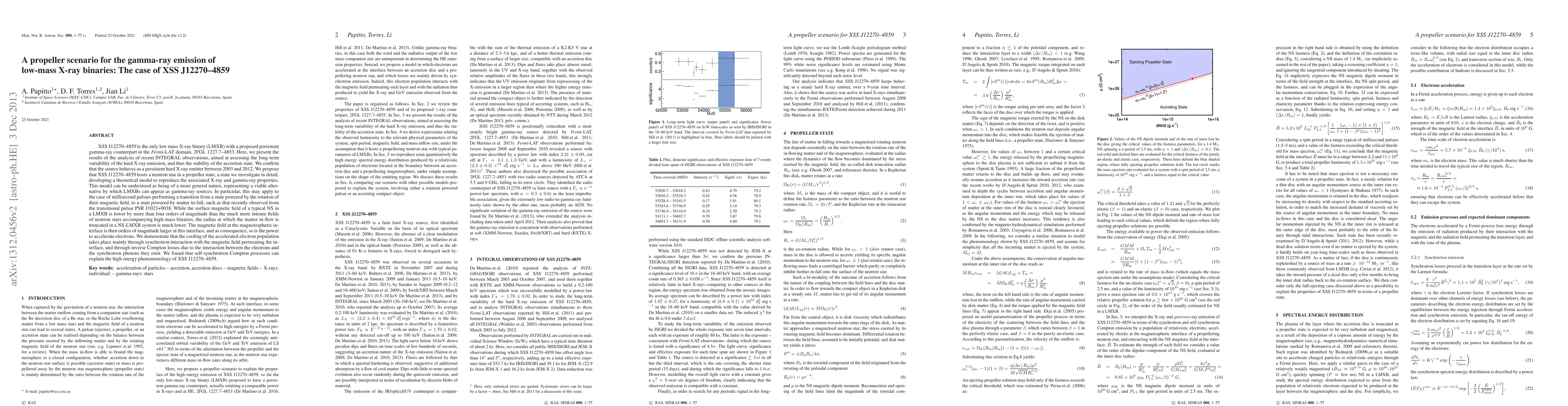 XSS J12270-4859 is the only low mass X-ray binary (LMXB) with a proposed persistent gamma-ray counterpart in the Fermi-LAT domain, 2FGL 1227.7-4853. Here, we present the results of the analysis of recent INTEGRAL observations, aimed at assessing the long-term variability of the hard X-ray emission, and thus the stability of the accretion state. We confirm that the source behaves as a persistent hard X-ray emitter between 2003 and 2012. We propose that XSS J12270-4859 hosts a neutron star in a propeller state, a state we investigate in detail, developing a theoretical model to reproduce the associated X-ray and gamma-ray properties. This model can be understood as being of a more general nature, representing a viable alternative by which LMXBs can appear as gamma-ray sources. In particular, this may apply to the case of millisecond pulsars performing a transition from a state powered by the rotation of their magnetic field, to a state powered by matter in-fall, such as that recently observed from the transitional pulsar PSR J1023+0038. While the surface magnetic field of a typical NS in a LMXB is lower by more than four orders of magnitude than the much more intense fields of neutron stars accompanying high-mass binaries, the radius at which the matter in-flow is truncated in a NS-LMXB system is much lower. The magnetic field at the magnetospheric interface is then orders of magnitude larger at this interface, and as consequence, so is the power to accelerate electrons. We demonstrate that the cooling of the accelerated electron population takes place mainly through synchrotron interaction with the magnetic field permeating the interface, and through inverse Compton losses due to the interaction between the electrons and the synchrotron photons they emit. We found that self-synchrotron Compton processes can explain the high energy phenomenology of XSS J12270-4859.