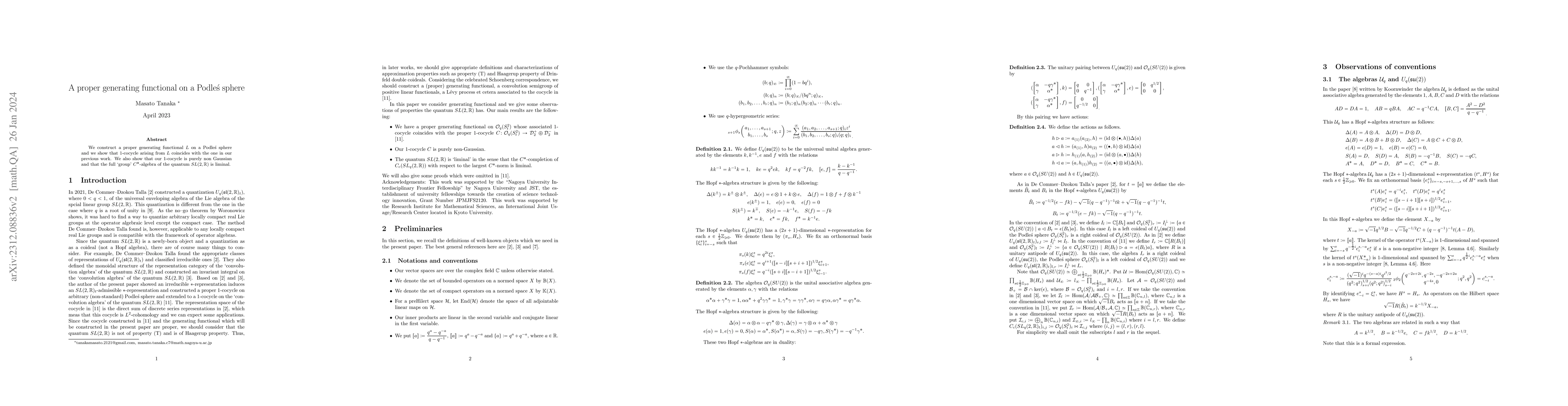 We construct a proper generating functional $L$ on a Podle\'{s} sphere and we show that $1$-cocycle arising from $L$ coincides with the one in our previous work. We also show that our 1-cocycle is purely non Gaussian and that the full `group' $C^{\ast}$-algebra of the quantum $SL(2,\mathbb{R})$ is liminal.