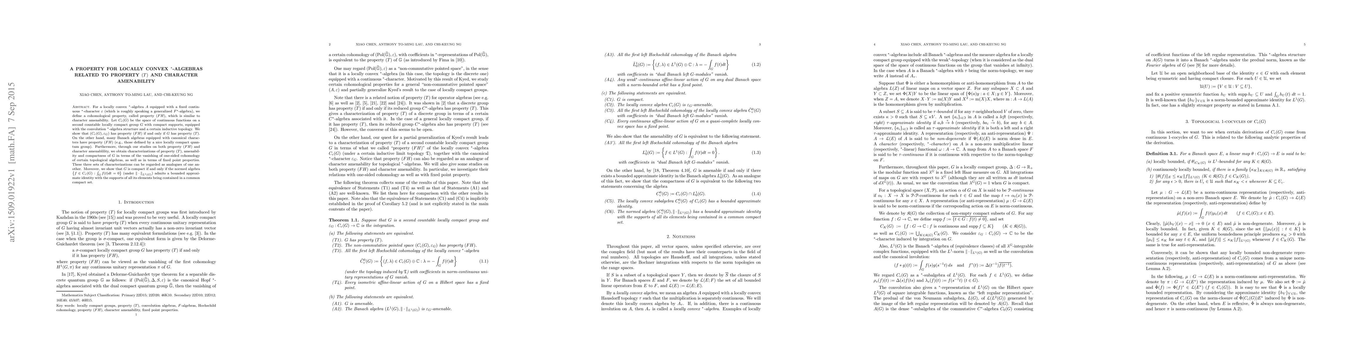 For a locally convex $^*$-algebra $A$ equipped with a fixed continuous $^*$-character $\varepsilon$, we define a cohomological property, called property $(FH)$, which is similar to character amenability. Let $C_c(G)$ be the space of continuous functions on a second countable locally compact group $G$ with compact supports, equipped with the convolution $^*$-algebra structure and a certain inductive topology. We show that $(C_c(G), \varepsilon_G)$ has property $(FH)$ if and only if $G$ has property $(T)$. On the other hand, many Banach algebras equipped with canonical characters have property $(FH)$ (e.g., those defined by a nice locally compact quantum group). Furthermore, through our studies on both property $(FH)$ and character amenablility, we obtain characterizations of property $(T)$, amenability and compactness of $G$ in terms of the vanishing of one-sided cohomology of certain topological algebras, as well as in terms of fixed point properties. These characterizations can be regarded as analogues of one another. Moreover, we show that $G$ is compact if and only if the normed algebra $\big\{f\in C_c(G): \int_G f(t)dt =0\big\}$ (under $\|\cdot\|_{L^1(G)}$) admits a bounded approximate identity with the supports of all its elements being contained in a common compact set.