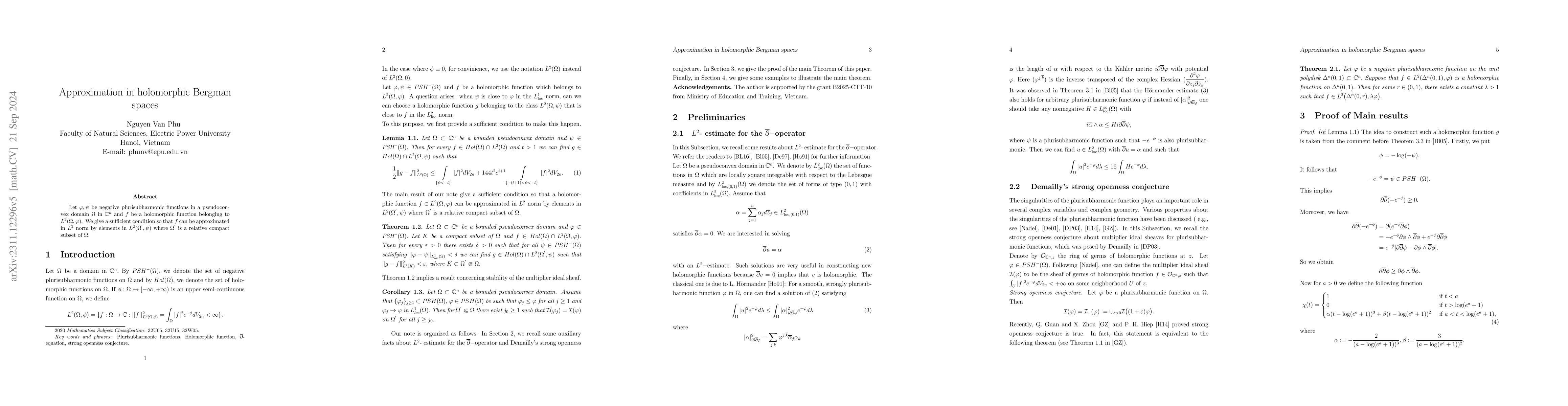 This paper proves that for a bounded holomorphic function $f$ in $L^{2}(\Omega, \varphi)$ where $\varphi$ is a negative plurisubharmonic function in a pseudoconvex domain $\Omega$, there exists a holomorphic function $g$ in $L^{2}(\Omega, \psi)$ close to $f$ in $L^2$ norm, provided $\psi$ is close to $\varphi$ in $L^1(\Omega)$ norm.