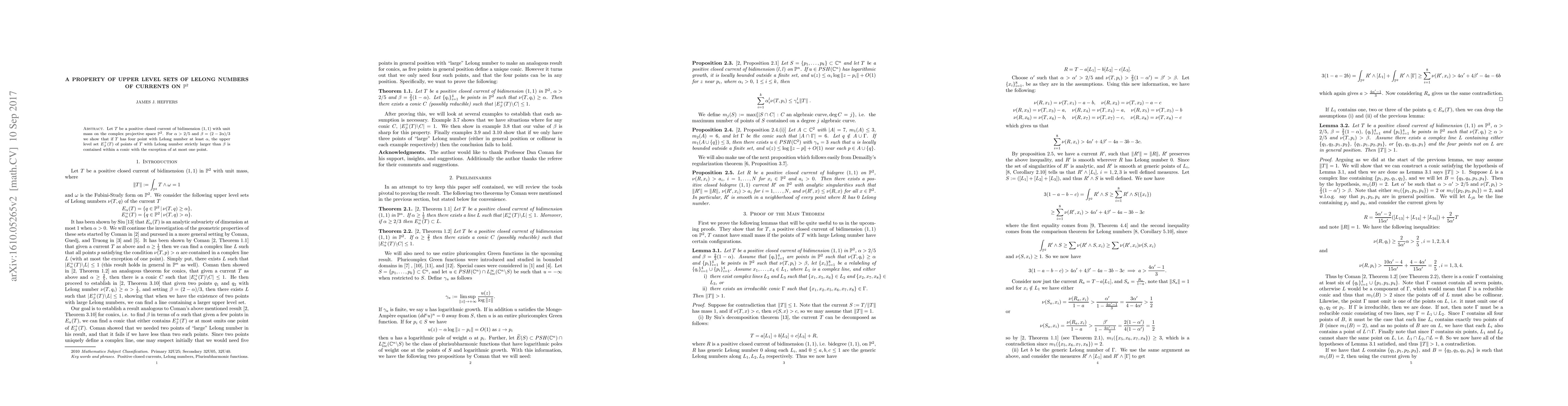 Researchers show that for a specific type of mathematical current on the complex projective space P^2, a large portion of its points with high Lelong numbers lie within a particular conic shape, except for at most one point.