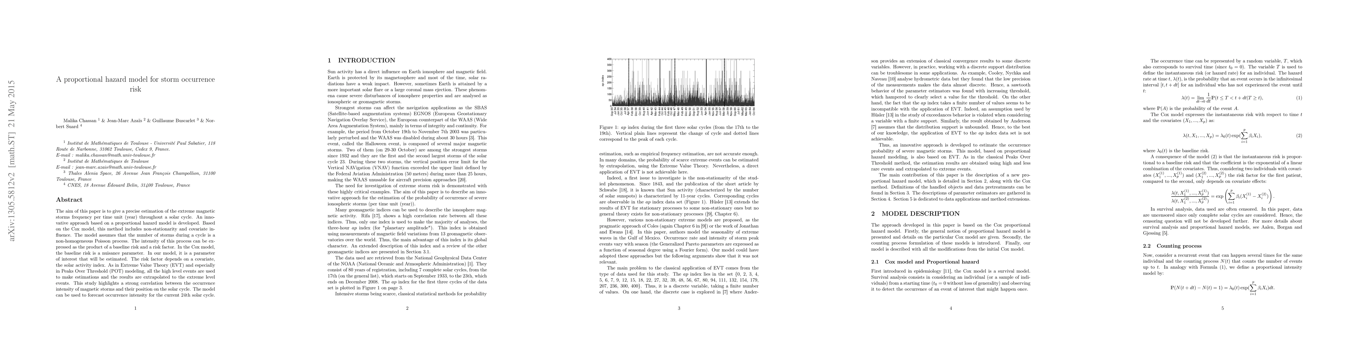 Severe Ionosphere magnetic storms are feared events for integrity and continuity of navigation systems such as EGNOS, the European SBAS (Satellite-Based Augmentation System) complementing GPS and an accurate modelling of this event probability is necessary. Our aim for the work presented in this paper is to give an estimation of the frequency of such extreme magnetic storms per time unit (year) throughout a solar cycle. Thus, we develop an innovative approach based on a proportional hazard model, inspired by the Cox model, with time dependent covariates. The number of storms during a cycle is supposed to be a non-homogeneous Poisson process. The intensity of this process could be expressed as the product of a baseline risk and a risk factor. Contrary to what is done in the Cox model, the baseline risk is one parameter of interest (and not a nuisance one), it is the intensity to estimate. As in Extreme Value Theory, all the high level events will be used to make estimation and the results will be extrapolated to the extreme level ones. After a precise description of the model, we present the estimation results and a model extension. A prediction for the current solar cycle (24th) is also proposed.