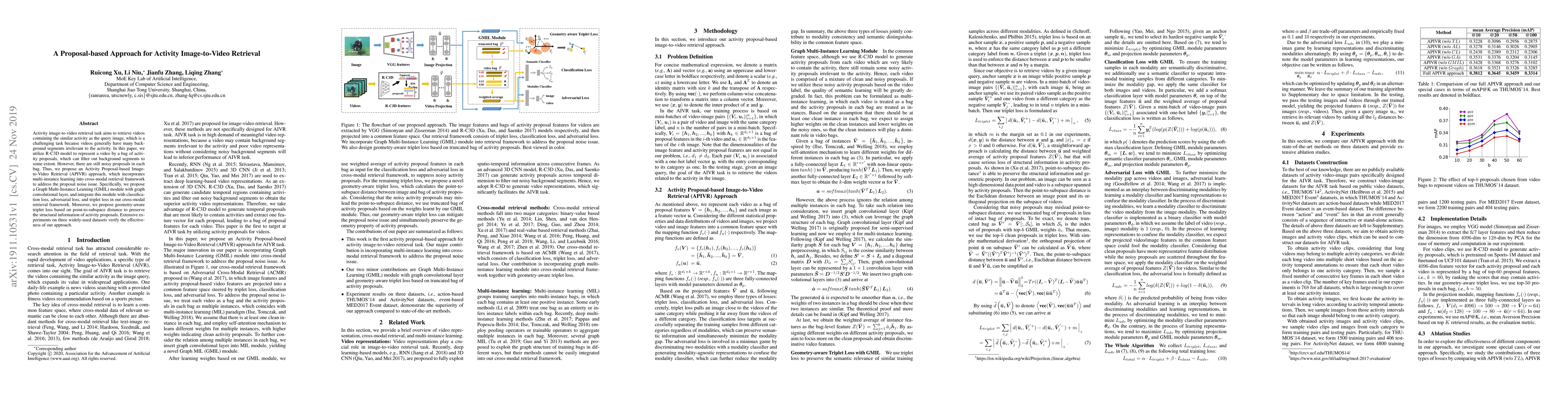 This paper proposes an Activity Proposal-based Image-to-Video Retrieval (APIVR) approach that uses R-C3D model representations and a Graph Multi-Instance Learning (GMIL) module to filter out irrelevant background segments in videos, addressing noisy proposal issues through a cross-modal retrieval framework enhanced with classification, adversarial, and geometry-aware triplet losses.