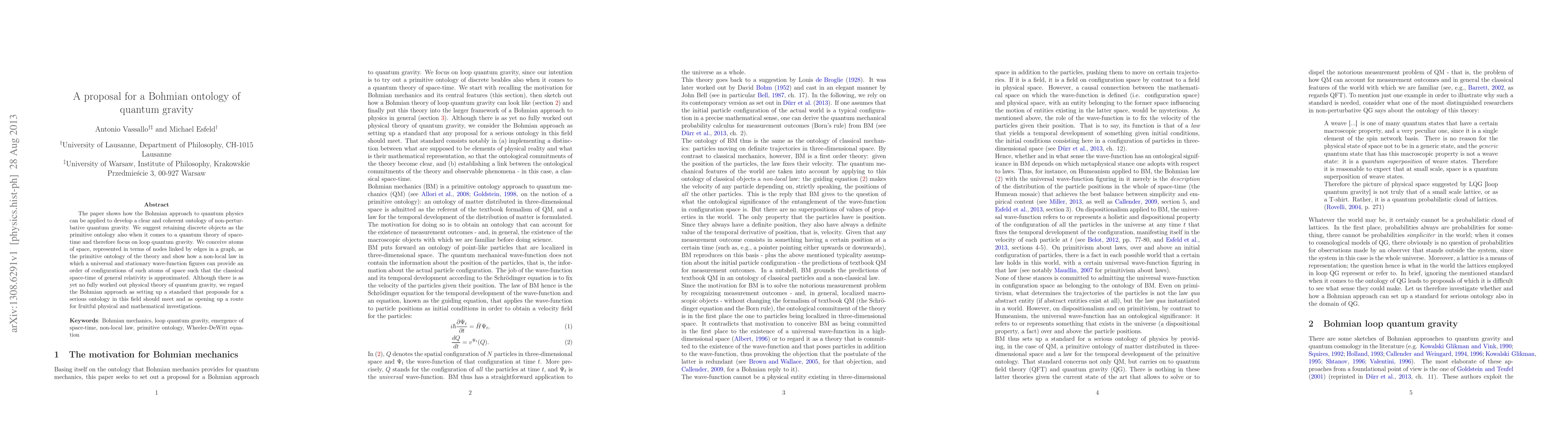 This paper proposes a Bohmian ontology for quantum gravity, using discrete objects as the primitive ontology, with atoms of space represented as nodes linked by edges in a graph. It aims to provide an order of configurations that approximates classical spacetime.