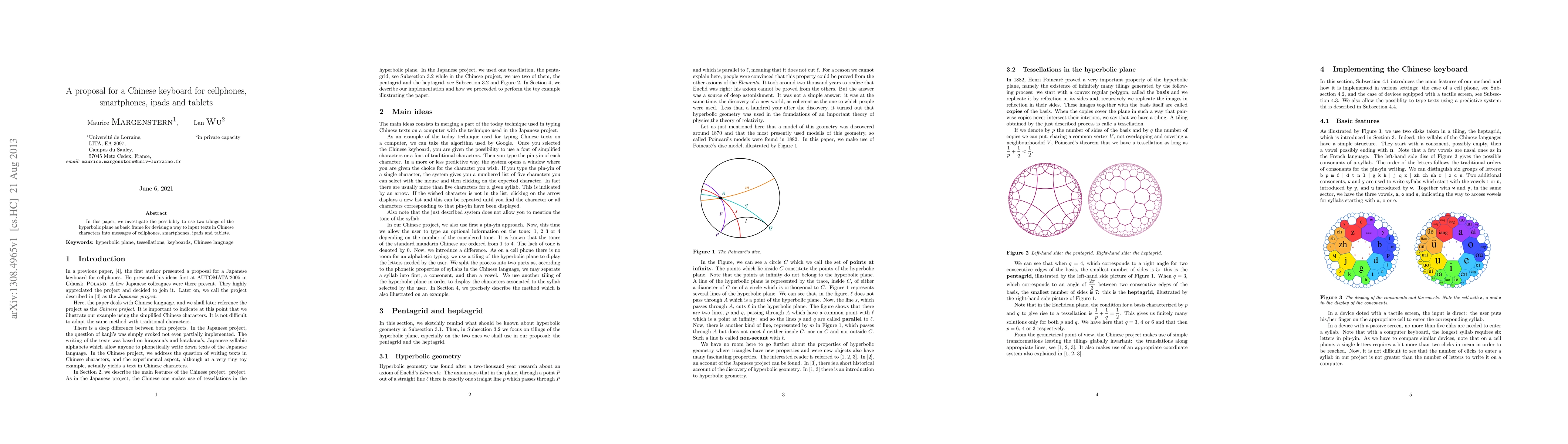 Summary: This paper proposes using two tilings of the hyperbolic plane to design an innovative Chinese keyboard for various digital devices, aiming to enhance text input for Chinese characters. The approach seeks to optimize the layout for efficient and effective character entry.