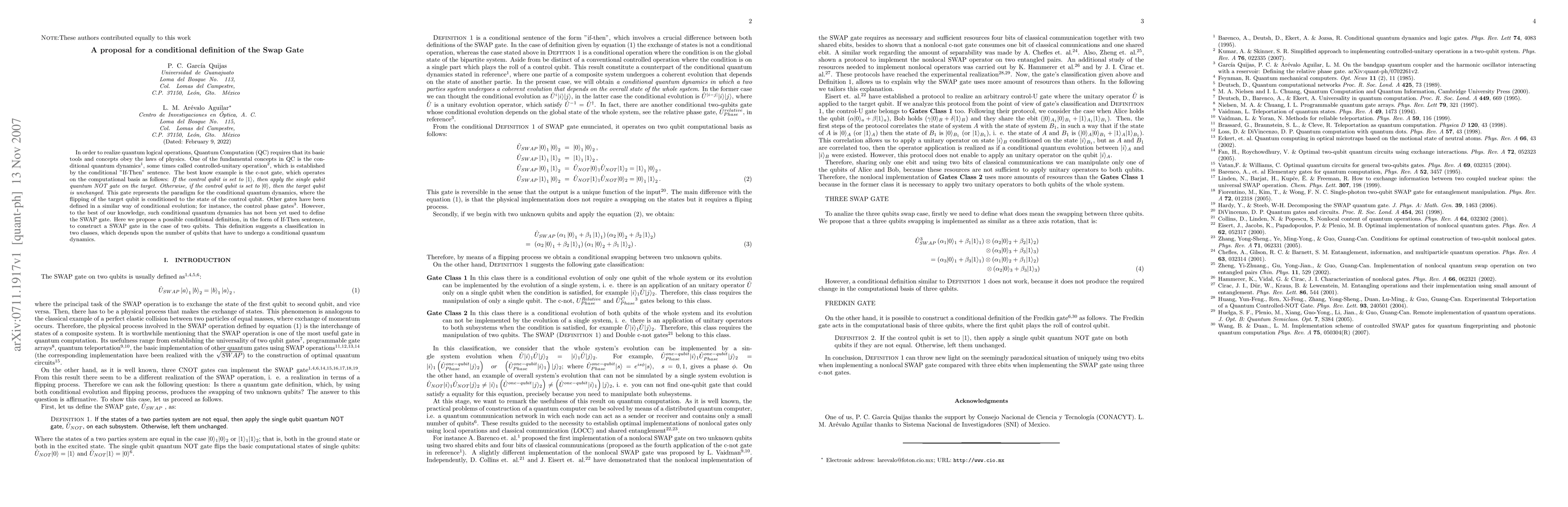 In order to realize quantum logical operations, Quantum Computation (QC) requires that its basic tools and concepts obey the laws of physics. One of the fundamental concepts in QC is the conditional quantum dynamics \cite{barenco}, some times called controlled-unitary operation \cite{kumar}, which is established by the conditional "If-Then" sentence. The best know example is the c-not gate, which operates on the computational basis as follows: \textit{If the control qubit is set to $% |1>$, then apply the single qubit quantum NOT gate on the target. Otherwise, if the control qubit is set to $|0>$, then the target qubit is unchanged}. This gate represents the paradigm for the conditional quantum dynamics, where the flipping of the target qubit is conditioned to the state of the control qubit. Other gates have been defined in a similar way of conditional evolution; for instance, the control phase gates \cite{paulo1}. However, to the best of our knowledge, such conditional quantum dynamics has not been yet used to define the SWAP gate. Here we propose a possible conditional definition, in the form of If-Then sentence, to construct a SWAP gate in the case of two qubits. This definition suggests a classification in two classes, which depends upon the number of qubits that have to undergo a conditional quantum dynamics.