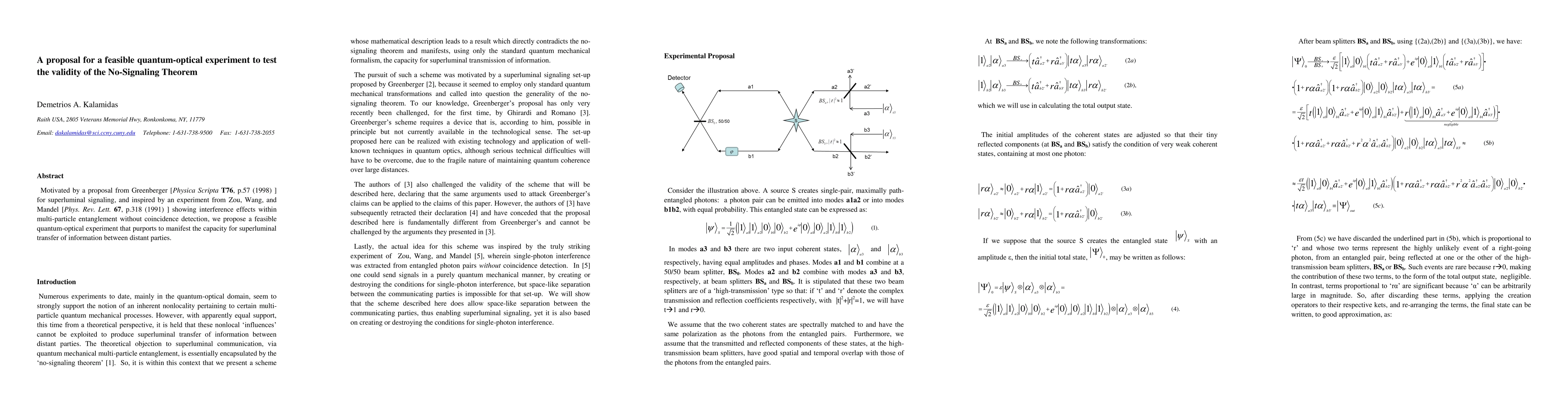 This paper proposes a quantum-optical experiment to test the No-Signaling Theorem, aiming to demonstrate superluminal information transfer, inspired by previous works on superluminal signaling and multi-particle entanglement. The experiment seeks to challenge the conventional understanding of information transfer in quantum mechanics.