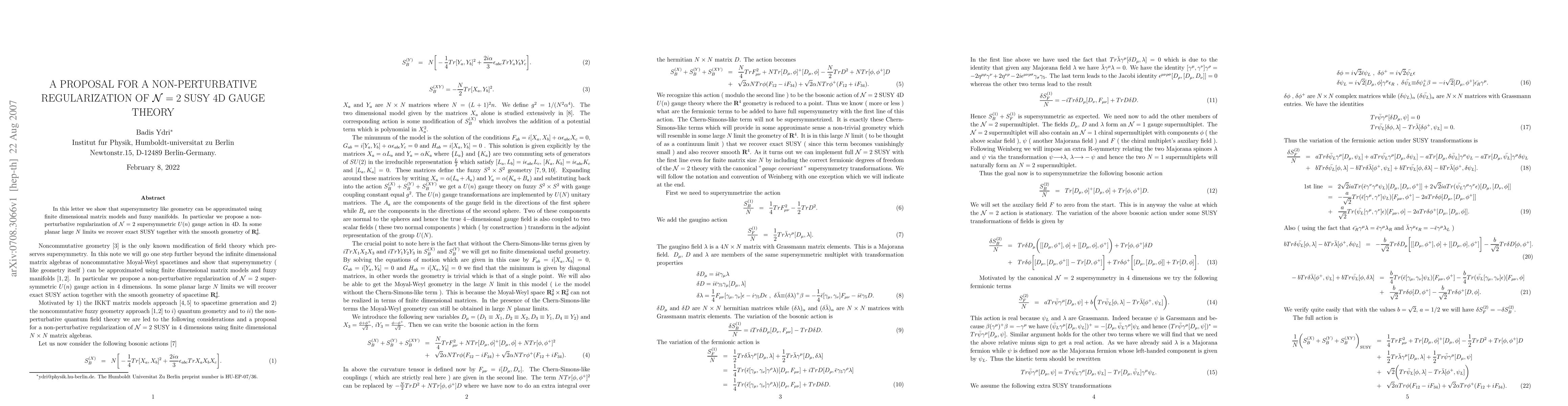 In this letter we show that supersymmetry like geometry can be approximated using finite dimensional matrix models and fuzzy manifolds. In particular we propose a non-perturbative regularization of {\cal N}=2 supersymmetric U(n) gauge action in 4D. In some planar large N limits we recover exact SUSY together with the smooth geometry of R^4_{theta}.