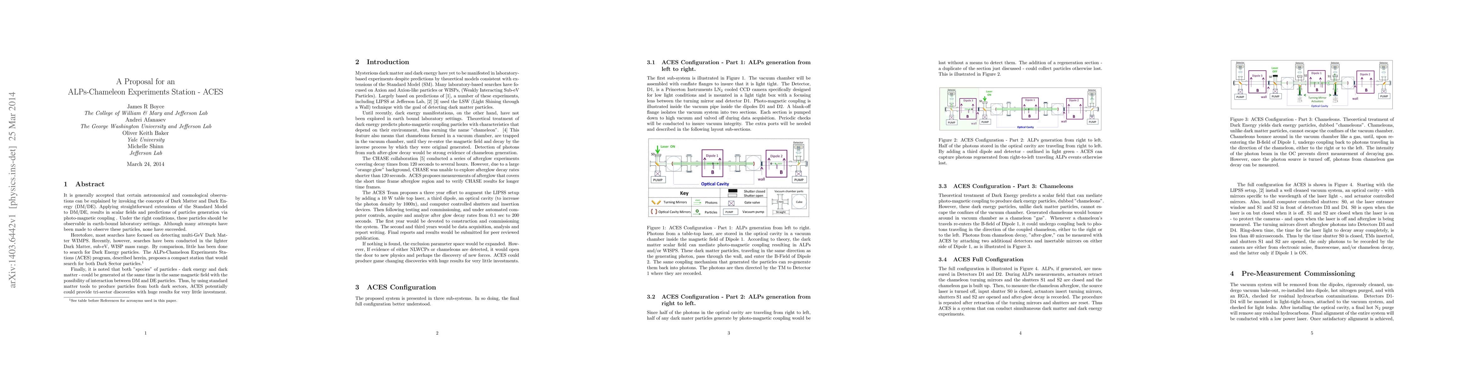 It is generally accepted that certain astronomical and cosmological observations can be explained by invoking the concepts of Dark Matter and Dark Energy (DM/DE). Applying straightforward extensions of the Standard Model to DM/DE, results in scalar fields and predictions of particles generation via photo-magnetic coupling . Under the right conditions, these particles should be observable in earth-bound laboratory settings. Although many attempts have been made to observe these particles, none have succeeded. Heretofore, most searches have focused on detecting multi-GeV Dark Matter WIMPS. Recently, however, searches have been conducted in the lighter dark matter, sub-eV, WISP mass range. By comparison, little has been done to search for dark energy particles. The ALPs-Chameleon Experiments Stations (ACES) program, described herein, proposes a compact station that would search for both dark sector particles. Finally, it is noted that both "species" of particles - dark energy and dark matter - could be generated at the same time in the same magnetic field with the possibility of interaction between DM and DE particles. Thus, by using standard matter tools to produce particles from both dark sectors, ACES potentially could provide tri-sector discoveries with huge results for very little investment.