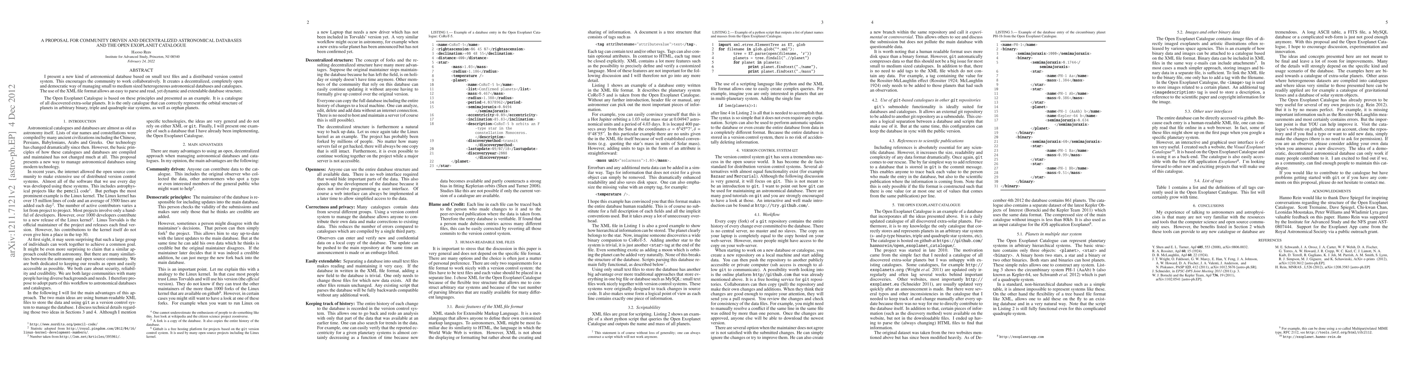 This paper proposes a decentralized, community-driven astronomical database using text files and version control, exemplified by the Open Exoplanet Catalogue, which dynamically manages extra-solar planets, including complex orbital structures in multi-star systems.