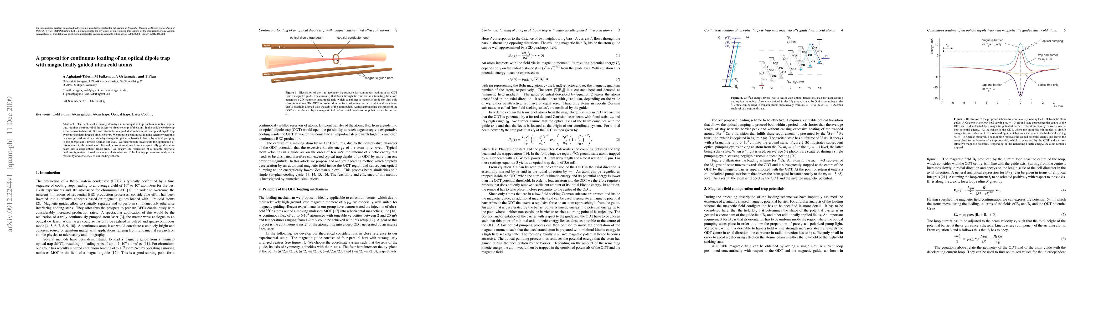 This paper proposes a continuous loading method for an optical dipole trap using magnetically guided ultra cold atoms, where kinetic energy is removed via a magnetic potential barrier and optical pumping to the lowest Zeeman sublevel. The feasibility and efficiency of the scheme are analyzed through theoretical investigation and numerical simulations.