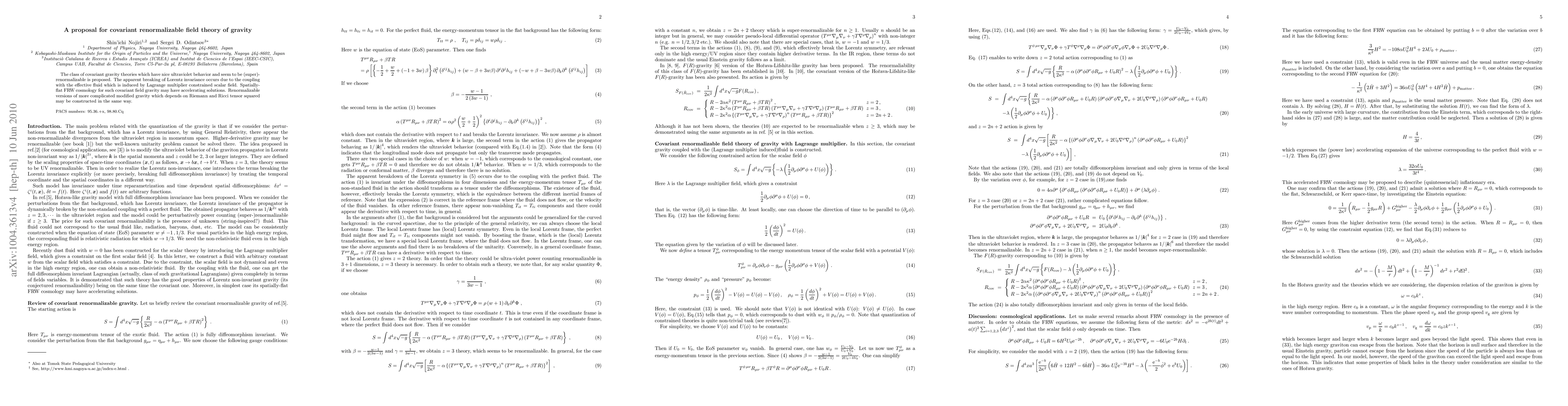 This paper proposes a new covariant renormalizable field theory of gravity with favorable ultraviolet behavior and potential for renormalizability, where Lorentz invariance is seemingly broken through coupling with an effective fluid induced by a scalar field. It also suggests that such theories can accommodate accelerating solutions in spatially-flat FRW cosmology.