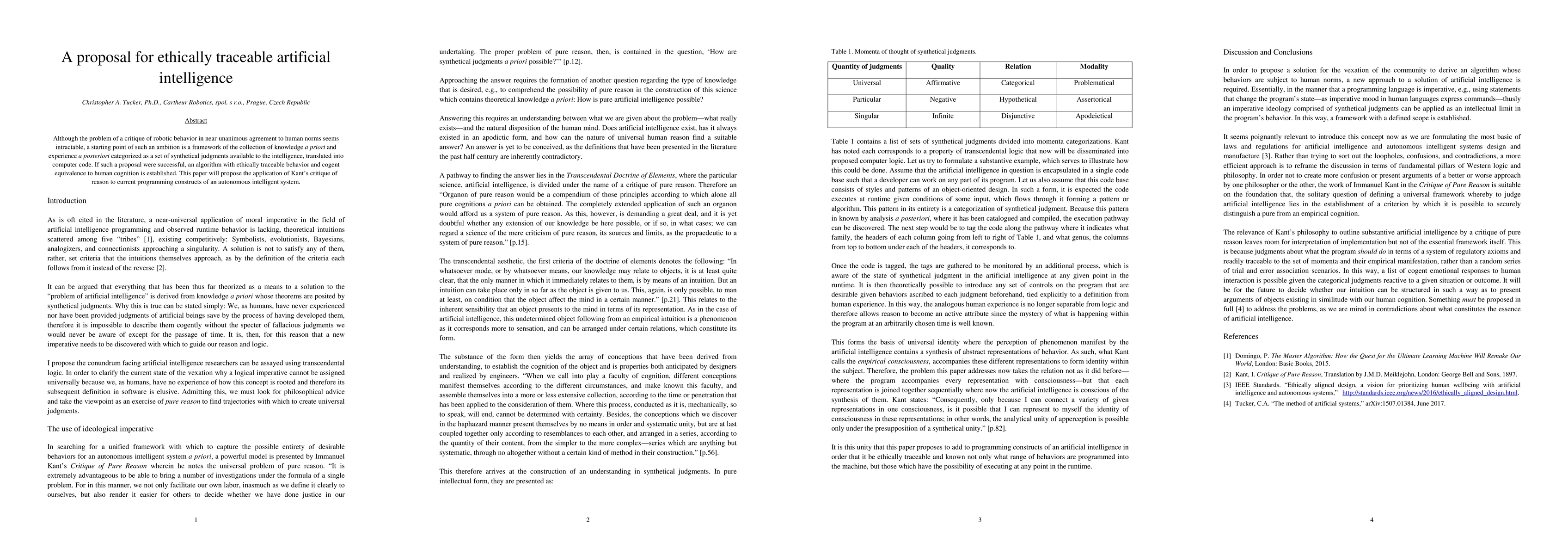 This paper proposes a framework for ethically traceable artificial intelligence by applying Kant's critique of reason to current programming constructs, aiming to develop an algorithm that mirrors human cognition and adheres to ethical standards.