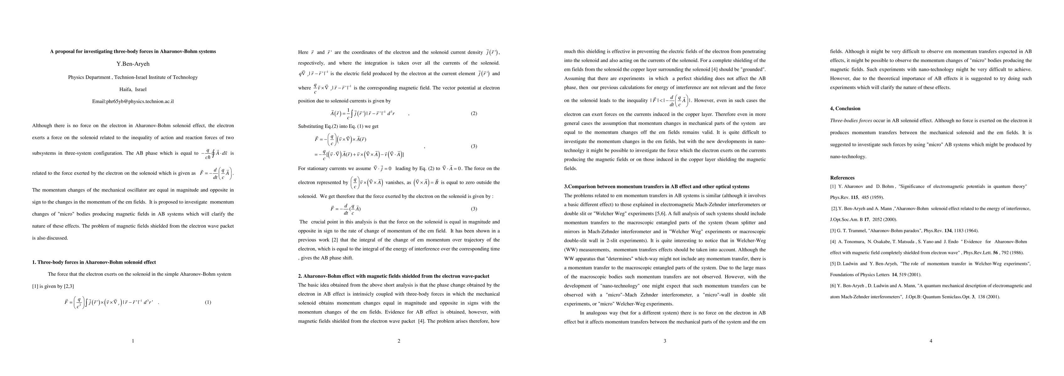 Although there is no force on the electron in Aharonov-Bohm solenoid effect, the electron exerts a force on the solenoid related to the inequality of action and reaction forces of two subsystems in three-system configuration. The AB phase which is related to the force exerted by the electron on the solenoid . The momentum changes of the mechanical oscillator are equal in magnitude and opposite in sign to the changes in the momentum of the em fields. It is proposed to investigate momentum changes of "micro" bodies producing magnetic fields in AB systems which will clarify the nature of these effects. The problem of magnetic fields shielded from the electron wave packet is also discussed.