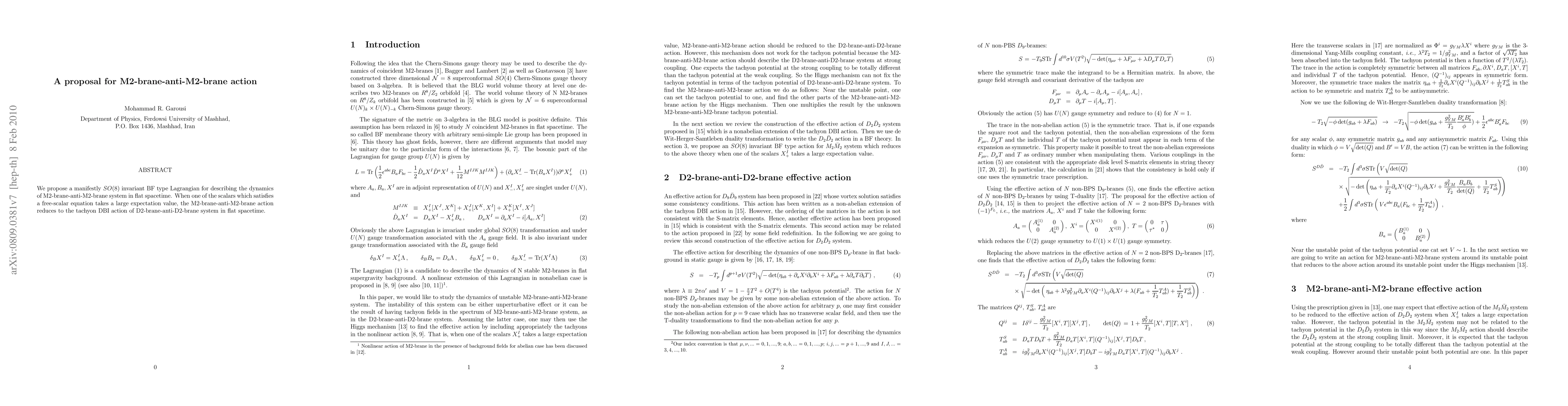 Summary: This paper proposes an SO(8) invariant BF type Lagrangian to describe the dynamics of M2-brane-anti-M2-brane interactions. It shows that under certain conditions, this model simplifies to the tachyon DBI action for D2-brane-anti-D2-brane systems.