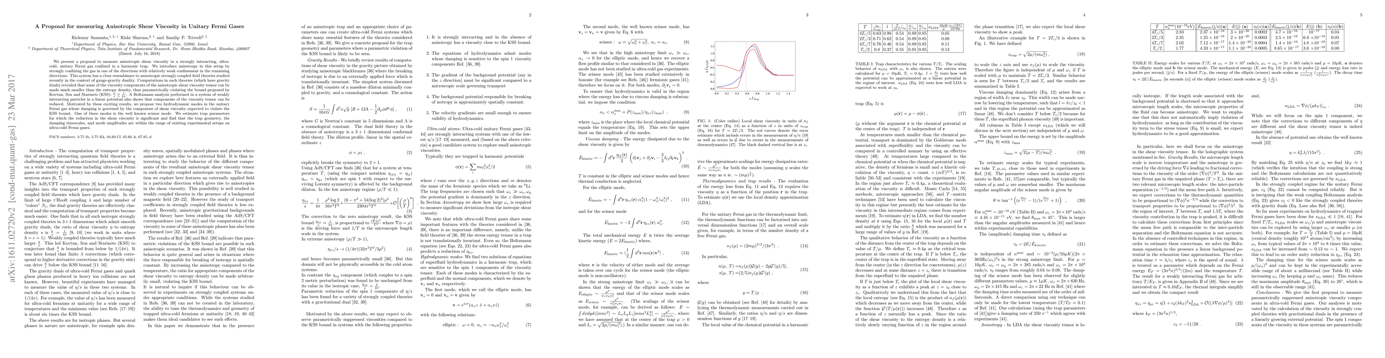 We present a proposal to measure anisotropic shear viscosity in a strongly interacting, ultra-cold, unitary Fermi gas confined in a harmonic trap. We introduce anisotropy in this setup by strongly confining the gas in one of the directions with relatively weak confinement in the remaining directions. This system has a close resemblance to anisotropic strongly coupled field theories studied recently in the context of gauge-gravity duality. Computations in such theories (which have gravity duals) revealed that some of the viscosity components of the anisotropic shear viscosity tensor can be made much smaller than the entropy density, thus parametrically violating the bound proposed by Kovtun, Son and Starinets (KSS): $\frac {\eta} {s} \geq \frac{1}{4 \pi}$. A Boltzmann analysis performed in a system of weakly interacting particles in a linear potential also shows that components of the viscosity tensor can be reduced. Motivated by these exciting results, we propose two hydrodynamic modes in the unitary Fermi gas whose damping is governed by the component of shear viscosity expected to violate the KSS bound. One of these modes is the well known scissor mode. We estimate trap parameters for which the reduction in the shear viscosity is of order unity and find that the trap geometry, the damping timescales, and mode amplitudes are within the range of existing experimental setups on ultra-cold Fermi gases.