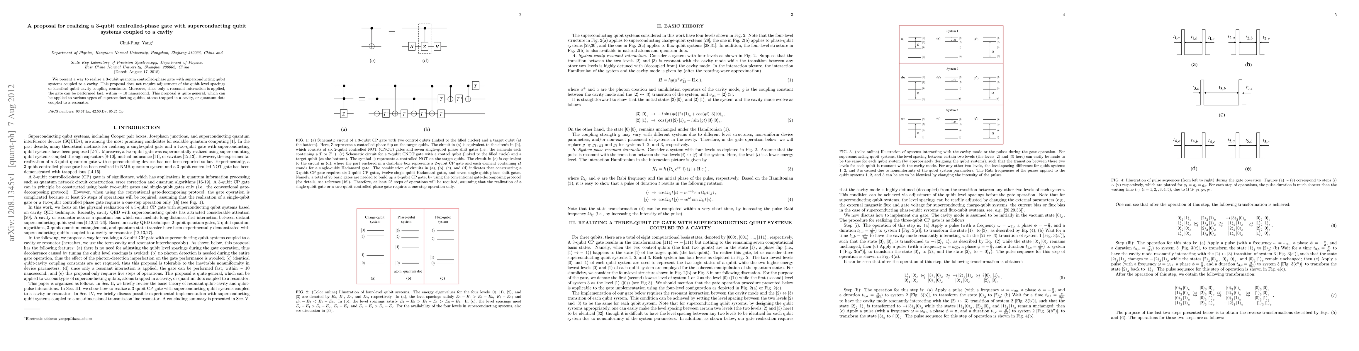 This paper proposes a method for implementing a 3-qubit controlled-phase gate using superconducting qubits coupled to a cavity, without requiring adjustments to qubit spacings or coupling constants. The gate can be executed rapidly, within approximately 10 nanoseconds, due to its resonant interaction.
