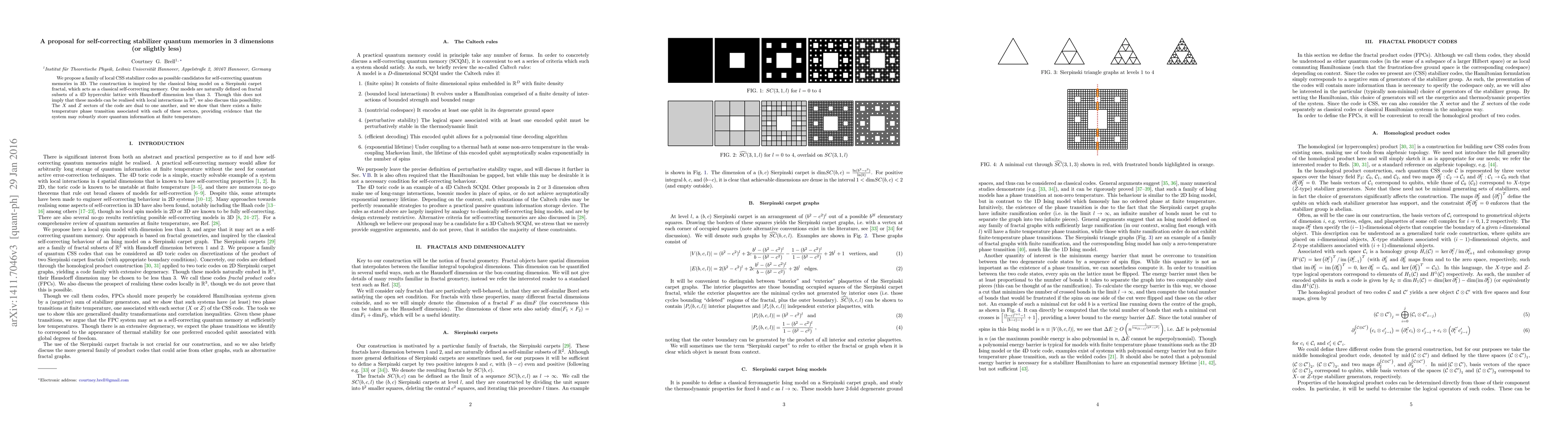 We propose a family of local CSS stabilizer codes as possible candidates for self-correcting quantum memories in 3D. The construction is inspired by the classical Ising model on a Sierpinski carpet fractal, which acts as a classical self-correcting memory. Our models are naturally defined on fractal subsets of a 4D hypercubic lattice with Hausdorff dimension less than 3. Though this does not imply that these models can be realised with local interactions in 3D Euclidean space, we also discuss this possibility. The X and Z sectors of the code are dual to one another, and we show that there exists a finite temperature phase transition associated with each of these sectors, providing evidence that the system may robustly store quantum information at finite temperature.