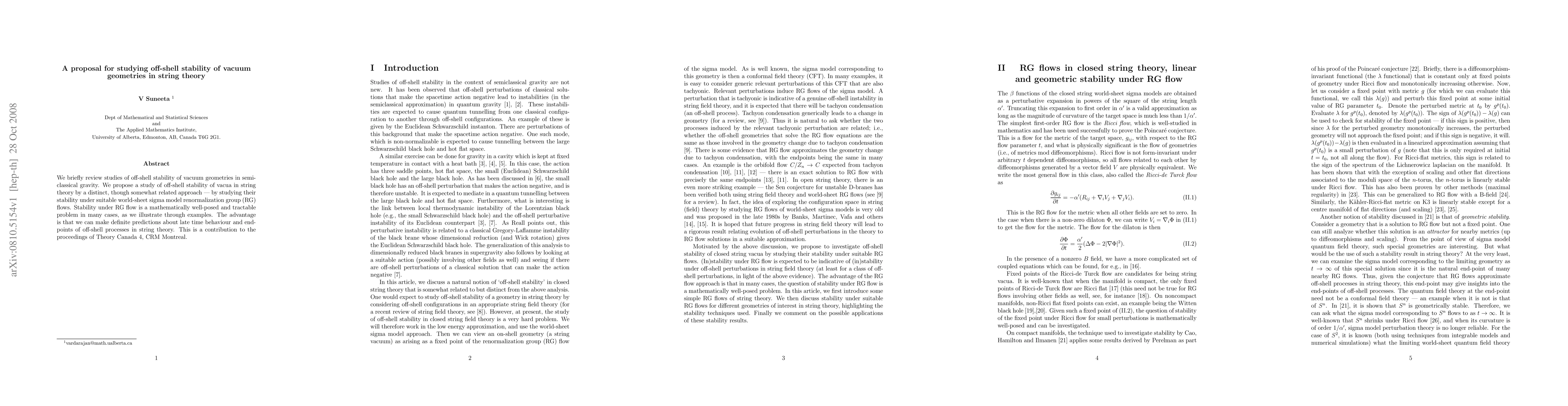We briefly review studies of off-shell stability of vacuum geometries in semiclassical gravity. We propose a study of off-shell stability of vacua in string theory by a distinct, though somewhat related approach -- by studying their stability under suitable world-sheet sigma model renormalization group (RG) flows. Stability under RG flow is a mathematically well-posed and tractable problem in many cases, as we illustrate through examples. The advantage is that we can make definite predictions about late time behaviour and endpoints of off-shell processes in string theory. This is a contribution to the proceedings of Theory Canada 4, CRM Montreal.