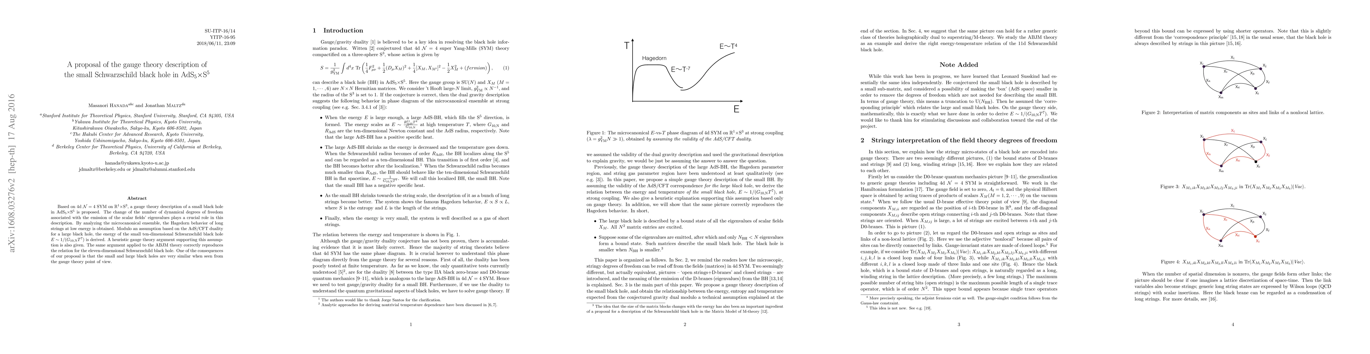 Based on 4d ${\cal N}=4$ SYM on $\mathbb{R}^{1}\times$S$^3$, a gauge theory description of a small black hole in AdS$_5\times$S$^5$ is proposed. The change of the number of dynamical degrees of freedom associated with the emission of the scalar fields' eigenvalues plays a crucial role in this description. By analyzing the microcanonical ensemble, the Hagedorn behavior of long strings at low energy is obtained. Modulo an assumption based on the AdS/CFT duality for a large black hole, the energy of the small ten-dimensional Schwarzschild black hole $E\sim 1/(G_{\rm 10,N}T^7)$ is derived. A heuristic gauge theory argument supporting this assumption is also given. The same argument applied to the ABJM theory correctly reproduces the relation for the eleven-dimensional Schwarzschild black hole. One of the consequences of our proposal is that the small and large black holes are very similar when seen from the gauge theory point of view.