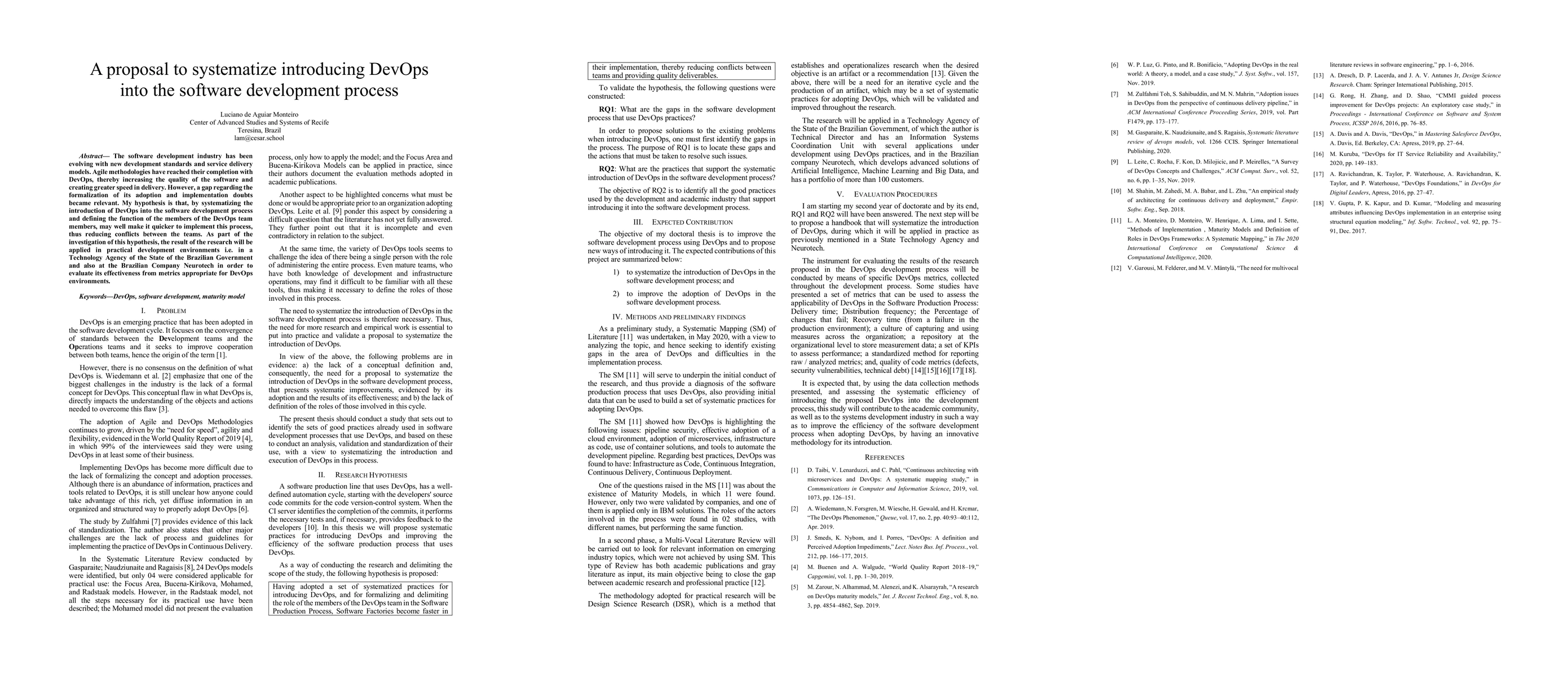 The software development industry has been evolving with new development standards and service delivery models. Agile methodologies have reached their completion with DevOps, thereby increasing the quality of the software and creating greater speed in delivery. However, a gap regarding the formalization of its adoption and implementation doubts became relevant. My hypothesis is that, by systematizing the introduction of DevOps into the software development process and defining the function of the members of the DevOps team members, may well make it quicker to implement this process, thus reducing conflicts between the teams. As part of the investigation of this hypothesis, the result of the research will be applied in practical development environments i.e. in a Technology Agency of the State of the Brazilian Government and also at the Brazilian Company Neurotech in order to evaluate its effectiveness from metrics appropriate for DevOps environments.