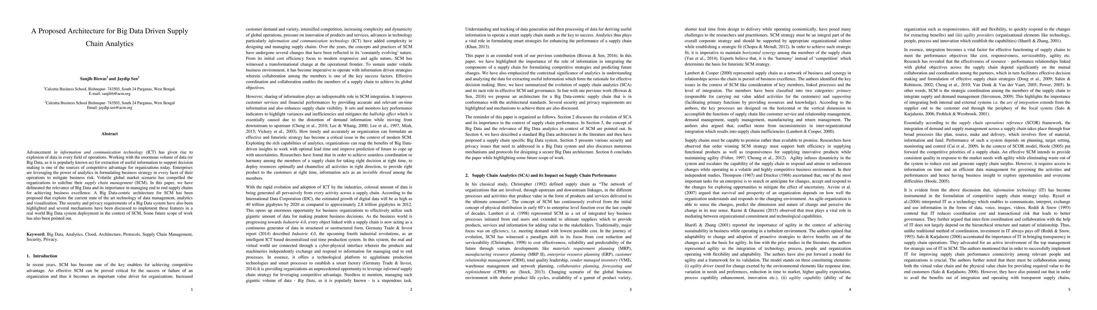 Advancement in information and communication technology (ICT) has given rise to explosion of data in every field of operations. Working with the enormous volume of data (or Big Data, as it is popularly known as) for extraction of useful information to support decision making is one of the sources of competitive advantage for organizations today. Enterprises are leveraging the power of analytics in formulating business strategy in every facet of their operations to mitigate business risk. Volatile global market scenario has compelled the organizations to redefine their supply chain management (SCM). In this paper, we have delineated the relevance of Big Data and its importance in managing end to end supply chains for achieving business excellence. A Big Data-centric architecture for SCM has been proposed that exploits the current state of the art technology of data management, analytics and visualization. The security and privacy requirements of a Big Data system have also been highlighted and several mechanisms have been discussed to implement these features in a real world Big Data system deployment in the context of SCM. Some future scope of work has also been pointed out. Keyword: Big Data, Analytics, Cloud, Architecture, Protocols, Supply Chain Management, Security, Privacy.