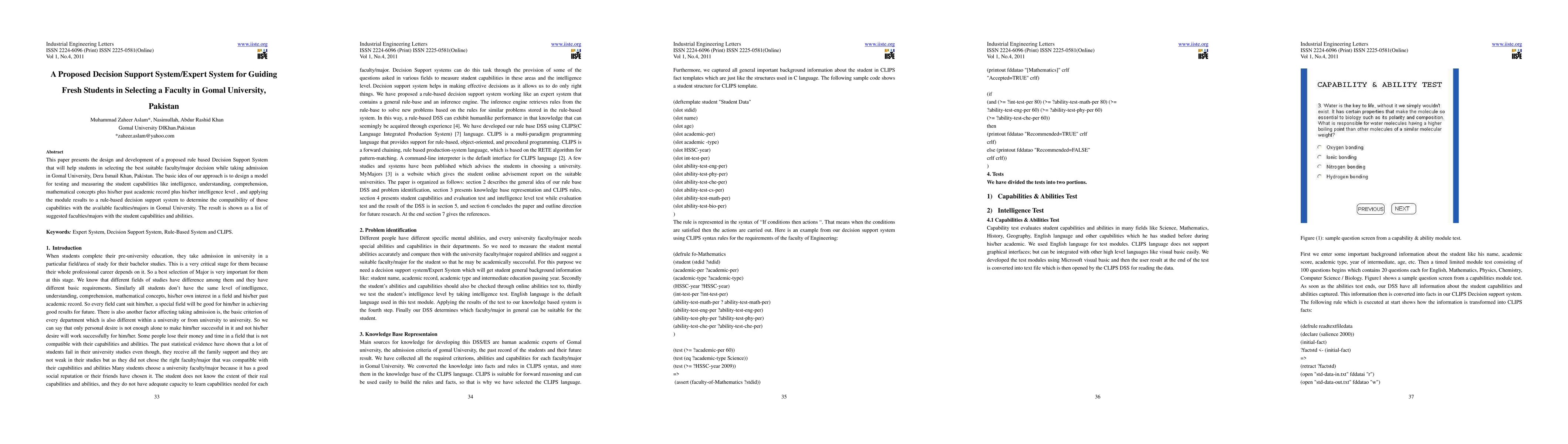This paper proposes a rule-based Decision Support System to assist fresh students in selecting suitable faculties at Gomal University by evaluating their capabilities and academic records, and matching them with the available majors. The system provides a list of recommended faculties based on the students' abilities.