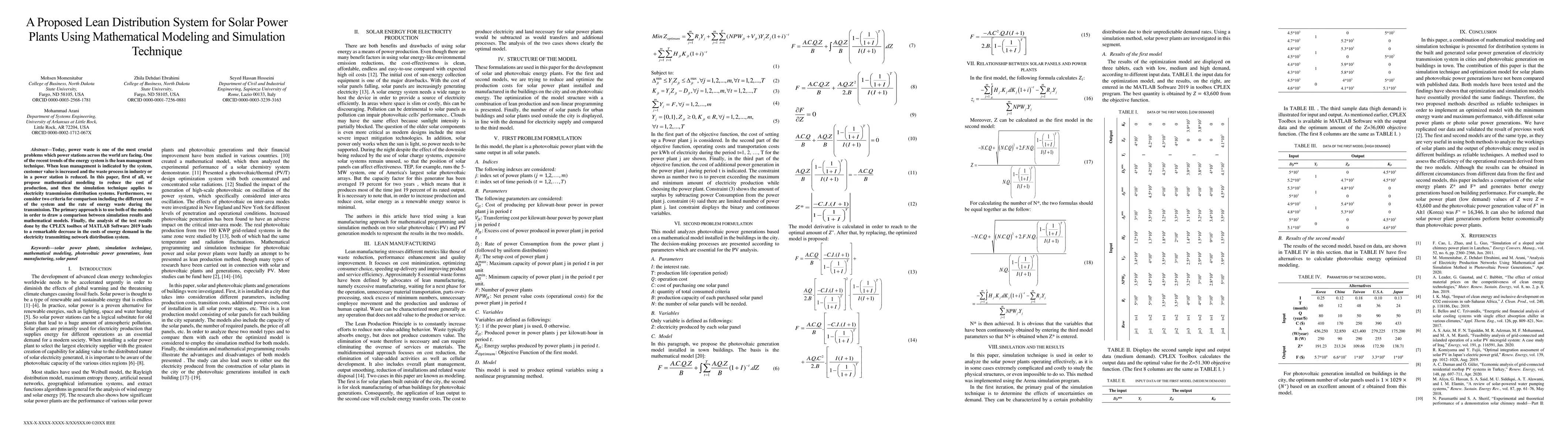 This paper proposes a lean distribution system for solar power plants using mathematical modeling and simulation techniques to reduce production costs and energy waste. The study compares different costs and energy waste rates, showing a significant decrease in energy demand costs through the application of CPLEX toolbox in MATLAB.