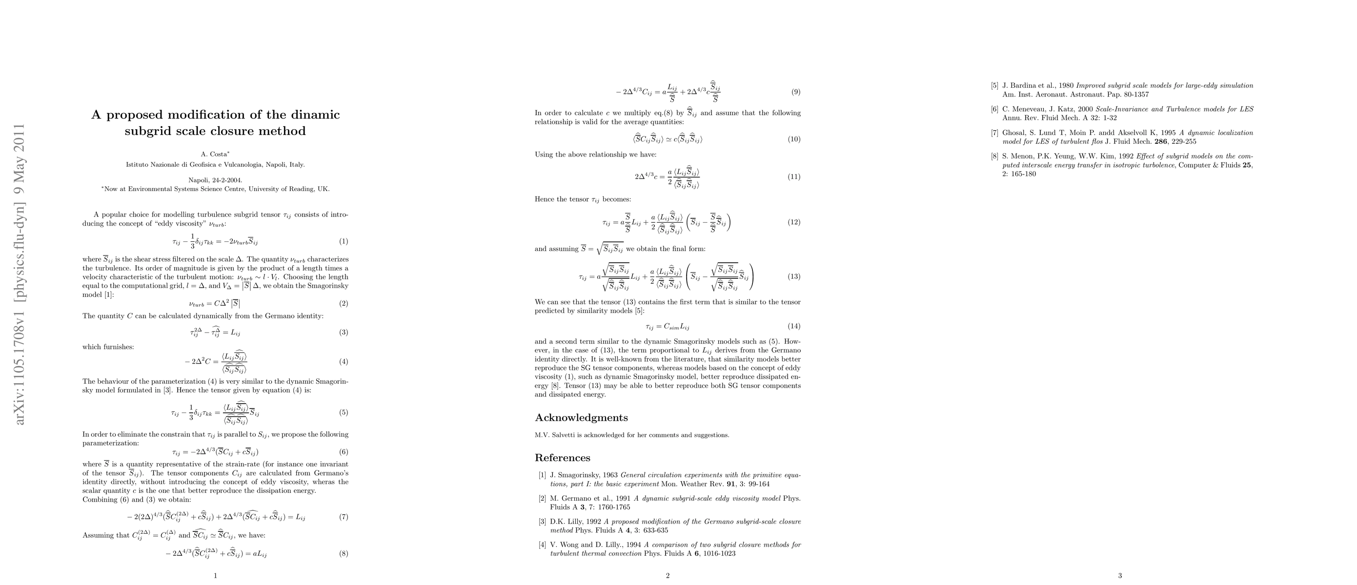 Summary: This paper proposes a modification to the dynamic subgrid scale closure method, aiming to enhance the accuracy of large eddy simulations (LES) by improving the modeling of turbulent flows at smaller scales. The suggested changes seek to better capture the energy transfer and dissipation mechanisms in turbulent flows.