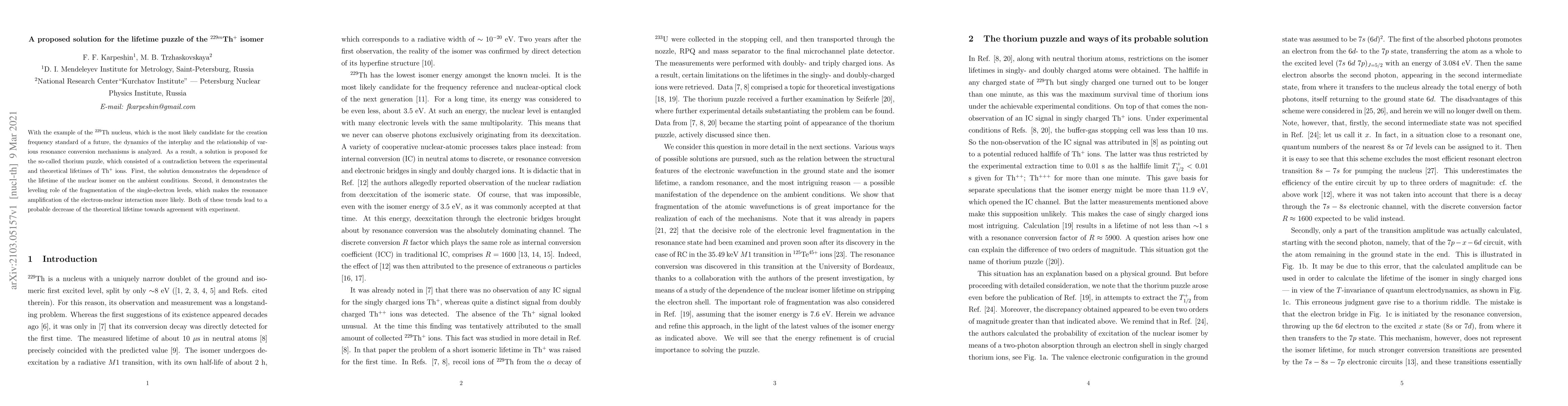 With the example of the 229Th nucleus, which is the most likely candidate for the creation frequency standard of a future, the dynamics of the interplay and the relationship of various resonance conversion mechanisms is analyzed. As a result, a solution is proposed for the so-called thorium puzzle, which consisted of a contradiction between the experimental and theoretical lifetimes of Th+ ions. First, the solution demonstrates the dependence of the lifetime of the nuclear isomer on the ambient conditions. Second, it demonstrates the leveling role of the fragmentation of the single-electron levels, which makes the resonance amplification of the electron-nuclear interaction more likely. Both of these trends lead to a probable decrease of the theoretical lifetime towards agreement with experiment.