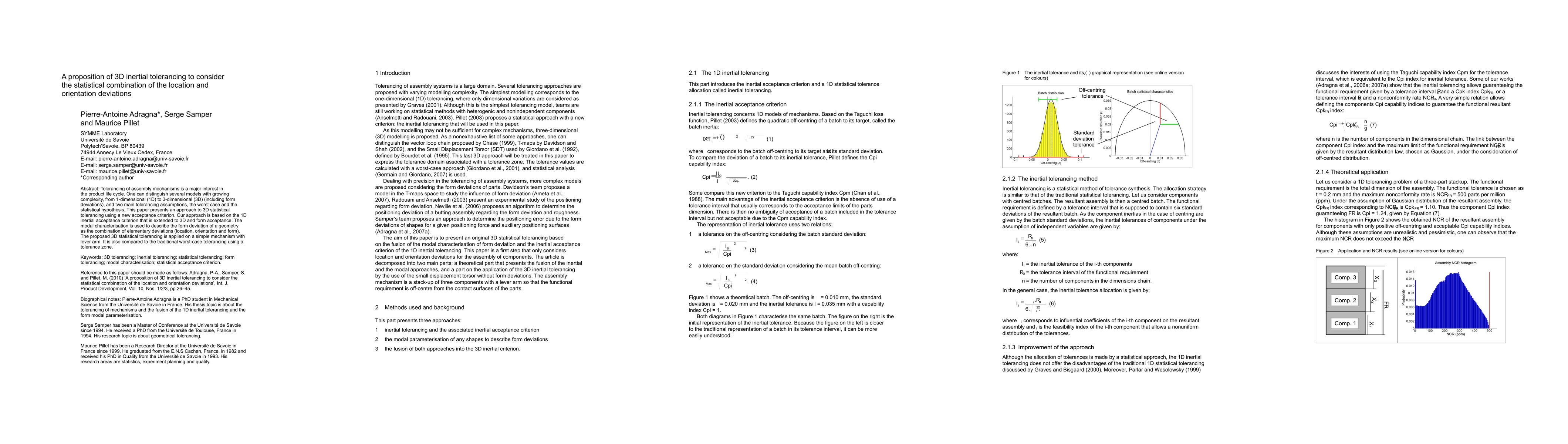 Tolerancing of assembly mechanisms is a major interest in the product life cycle. One can distinguish several models with growing complexity, from 1-dimensional (1D) to 3-dimensional (3D) (including form deviations), and two main tolerancing assumptions, the worst case and the statistical hypothesis. This paper presents an approach to 3D statistical tolerancing using a new acceptance criterion. Our approach is based on the 1D inertial acceptance criterion that is extended to 3D and form acceptance. The modal characterisation is used to describe the form deviation of a geometry as the combination of elementary deviations (location, orientation and form). The proposed 3D statistical tolerancing is applied on a simple mechanism with lever arm. It is also compared to the traditional worst-case tolerancing using a tolerance zone.