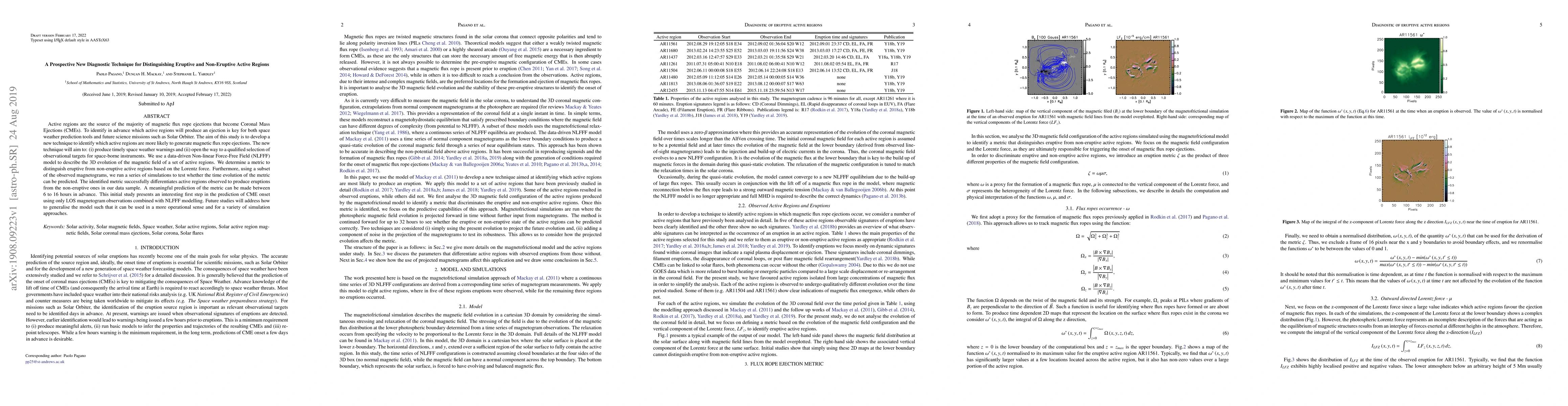Active regions are the source of the majority of magnetic flux rope ejections that become Coronal Mass Ejections (CMEs). To identify in advance which active regions will produce an ejection is key for both space weather prediction tools and future science missions such as Solar Orbiter. The aim of this study is to develop a new technique to identify which active regions are more likely to generate magnetic flux rope ejections. The new technique will aim to: (i) produce timely space weather warnings and (ii) open the way to a qualified selection of observational targets for space-borne instruments. We use a data-driven Non-linear Force-Free Field (NLFFF) model to describe the 3D evolution of the magnetic field of a set of active regions. We determine a metric to distinguish eruptive from non-eruptive active regions based on the Lorentz force. Furthermore, using a subset of the observed magnetograms, we run a series of simulations to test whether the time evolution of the metric can be predicted. The identified metric successfully differentiates active regions observed to produce eruptions from the non-eruptive ones in our data sample. A meaningful prediction of the metric can be made between 6 to 16 hours in advance. This initial study presents an interesting first step in the prediction of CME onset using only LOS magnetogram observations combined with NLFFF modelling. Future studies will address how to generalise the model such that it can be used in a more operational sense and for a variety of simulation approaches.