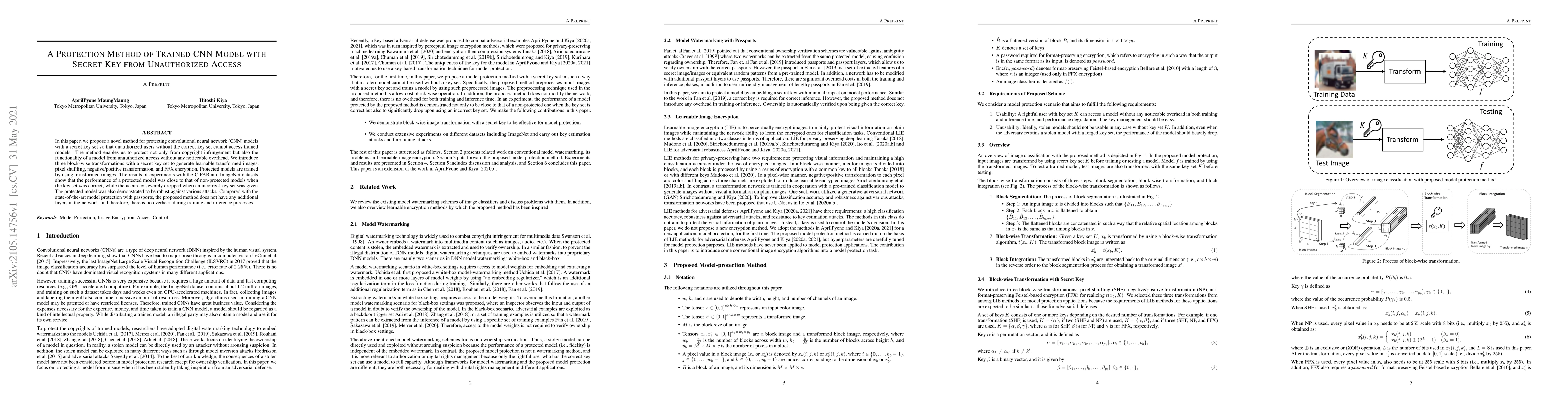 This paper introduces a method for securing trained CNN models using a secret key set, ensuring unauthorized users cannot access them. The method employs three transformations to generate learnable images, protecting the model's functionality without performance loss, and demonstrating robustness against attacks.