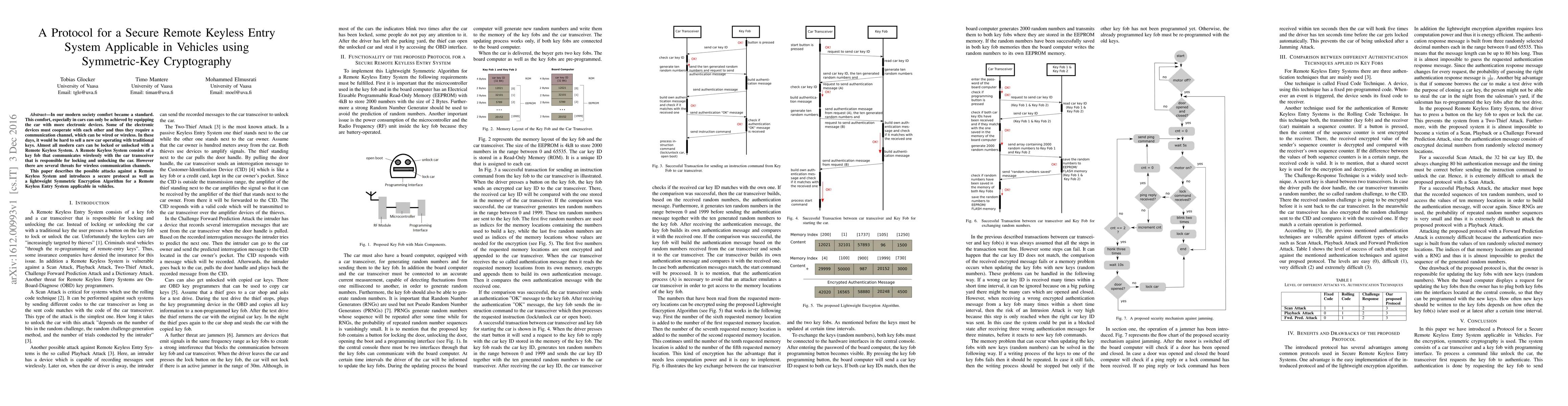 This paper discusses threats to wireless communication in modern cars and proposes a secure protocol and lightweight symmetric encryption algorithm to enhance the security of Remote Keyless Entry Systems in vehicles.