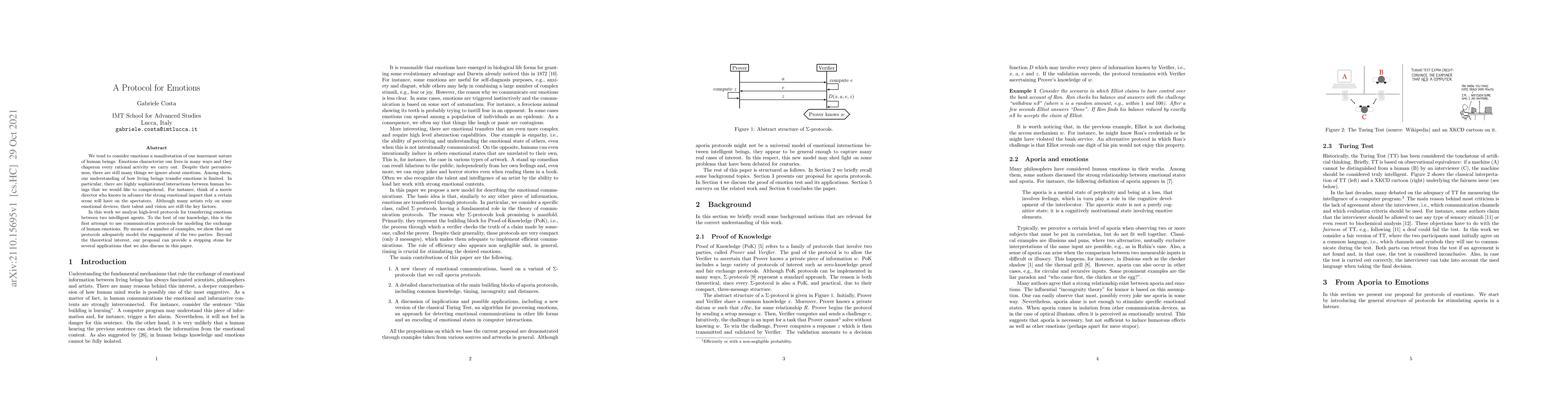 We tend to consider emotions a manifestation of our innermost nature of human beings. Emotions characterize our lives in many ways and they chaperon every rational activity we carry out. Despite their pervasiveness, there are still many things we ignore about emotions. Among them, our understanding of how living beings transfer emotions is limited. In particular, there are highly sophisticated interactions between human beings that we would like to comprehend. For instance, think of a movie director who knows in advance the strong emotional impact that a certain scene will have on the spectators. Although many artists rely on some emotional devices, their talent and vision are still the key factors. In this work we analyze high-level protocols for transferring emotions between two intelligent agents. To the best of our knowledge, this is the first attempt to use communication protocols for modeling the exchange of human emotions. By means of a number of examples, we show that our protocols adequately model the engagement of the two parties. Beyond the theoretical interest, our proposal can provide a stepping stone for several applications that we also discuss in this paper.