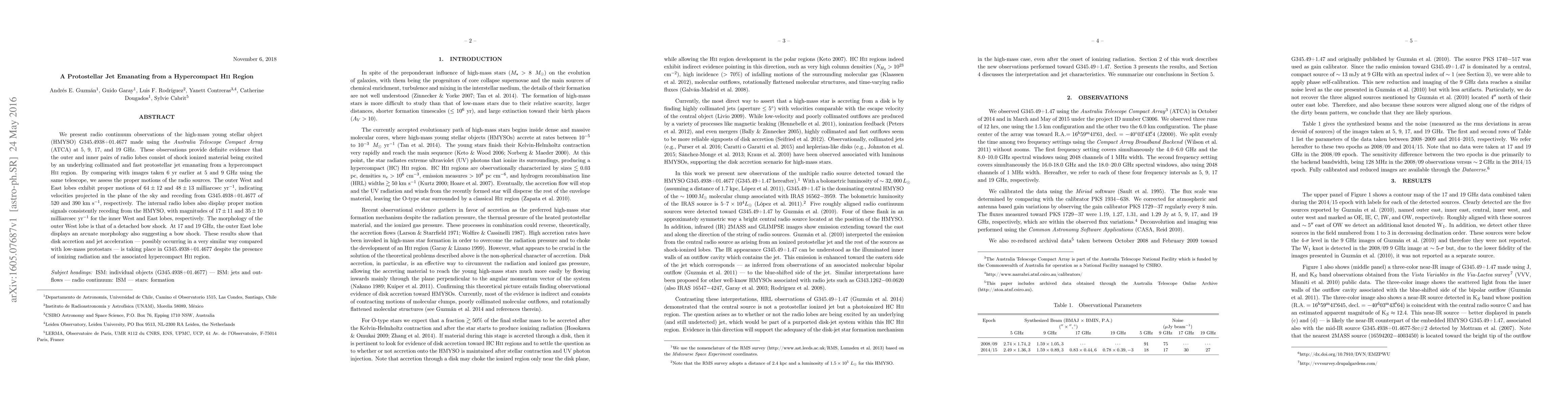 This paper reports radio observations of the high-mass young stellar object G345.4938+01.4677, revealing a collimated protostellar jet emanating from a hypercompact HII region. The jet's proper motions indicate high velocities, suggesting disk accretion and jet acceleration processes similar to those in low-mass protostars.