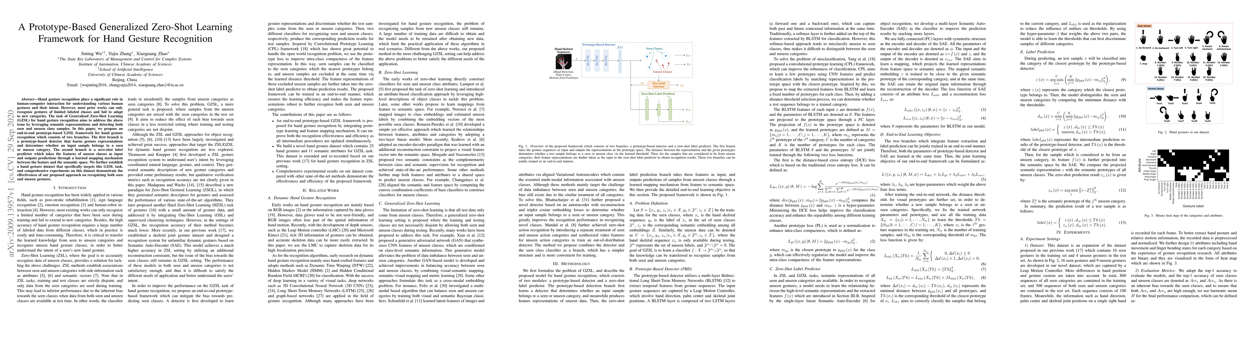 This paper proposes an end-to-end prototype-based Generalized Zero-Shot Learning framework for recognizing both seen and unseen hand gestures. The framework includes a prototype-based detector and a zero-shot label predictor, and is validated on a new hand gesture dataset.