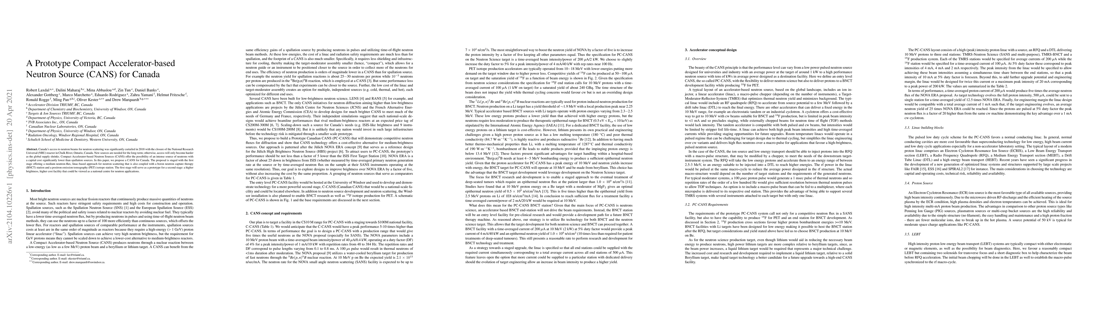 Canada's access to neutron beams for neutron scattering was significantly curtailed in 2018 with the closure of the National Research Universal (NRU) reactor in Chalk River, Ontario, Canada. New sources are needed for the long-term; otherwise, access will only become harder as the global supply shrinks. Compact Accelerator-based Neutron Sources (CANS) offer the possibility of an intense source of neutrons with a capital cost significantly lower than spallation sources. In this paper, we propose a CANS for Canada. The proposal is staged with the first stage offering a medium neutron-flux, linac-based approach for neutron scattering that is also coupled with a boron neutron capture therapy (BNCT) station and a positron emission tomography (PET) isotope station. The first stage will serve as a prototype for a second stage: a higher brightness, higher cost facility that could be viewed as a national centre for neutron applications.