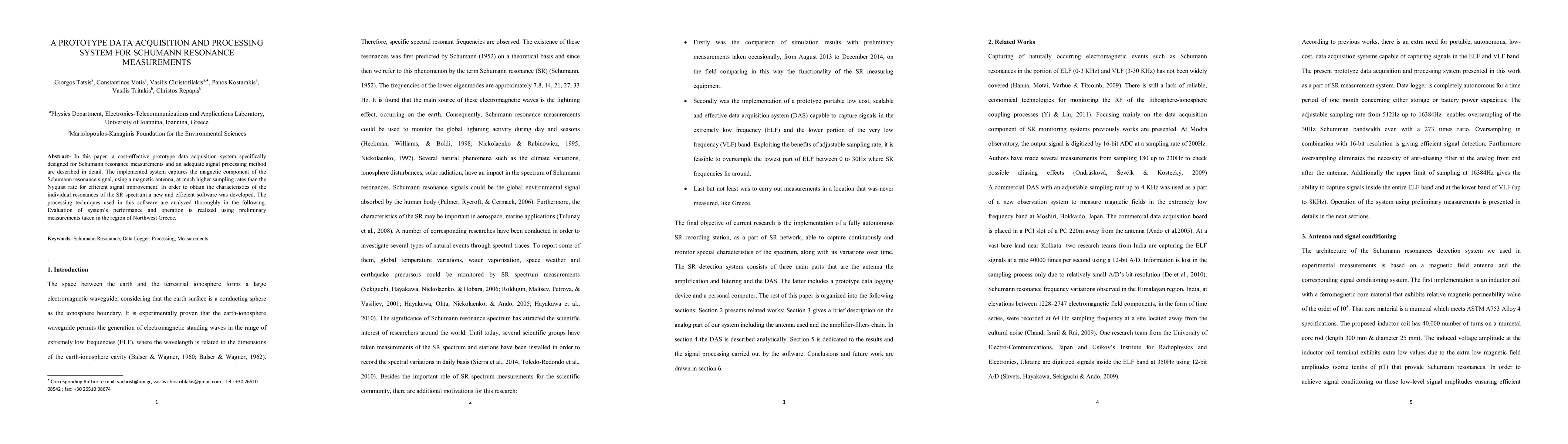 Researchers developed a cost-effective data acquisition system to measure Schumann resonance signals with higher sampling rates than the Nyquist rate, enabling more efficient signal improvement. The new software improved analysis of individual resonances in the SR spectrum through thorough processing techniques.
