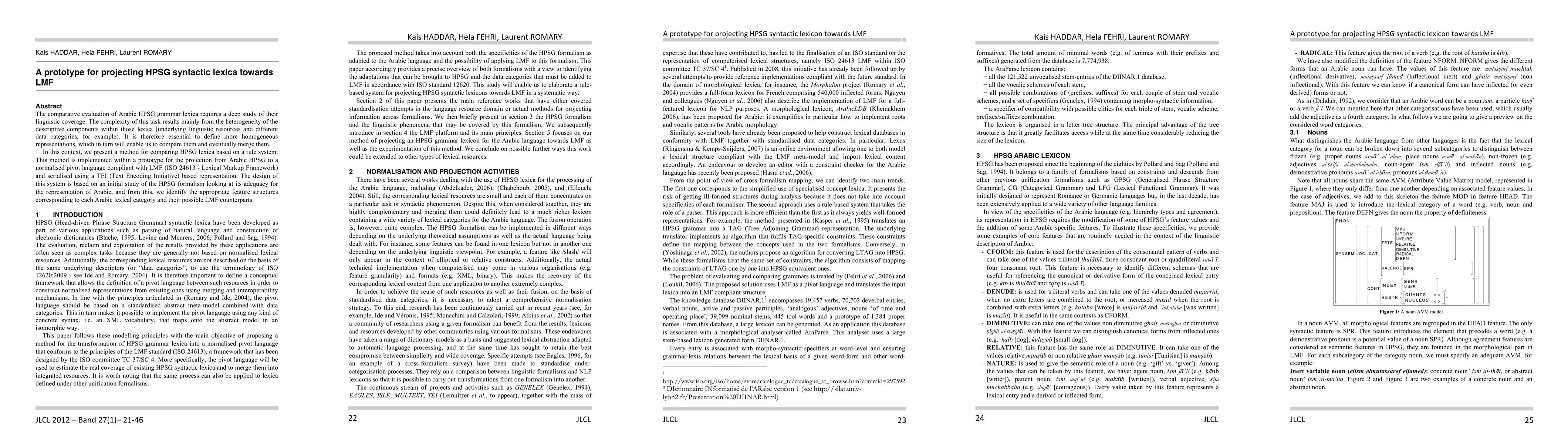 Researchers developed a method to compare Arabic HPSG grammar lexica based on a rule system, aiming to create homogeneous representations for comparison and potential merger. The project uses a prototype to project Arabic HPSG syntactic lexica towards the LMF standard.