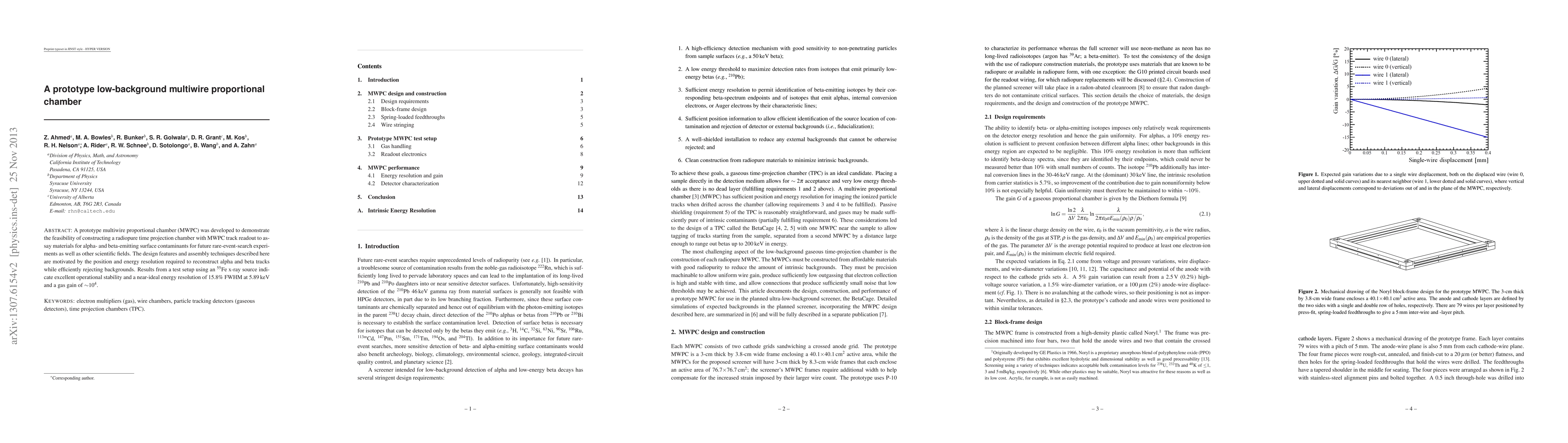 This paper presents a prototype low-background multiwire proportional chamber designed to detect alpha and low-energy beta particles, demonstrating high stability and an energy resolution of 15.8% FWHM at 5.89 keV, suitable for future rare-event searches and material contamination assays. The chamber's design focuses on achieving precise track and energy resolution while effectively rejecting background noise.