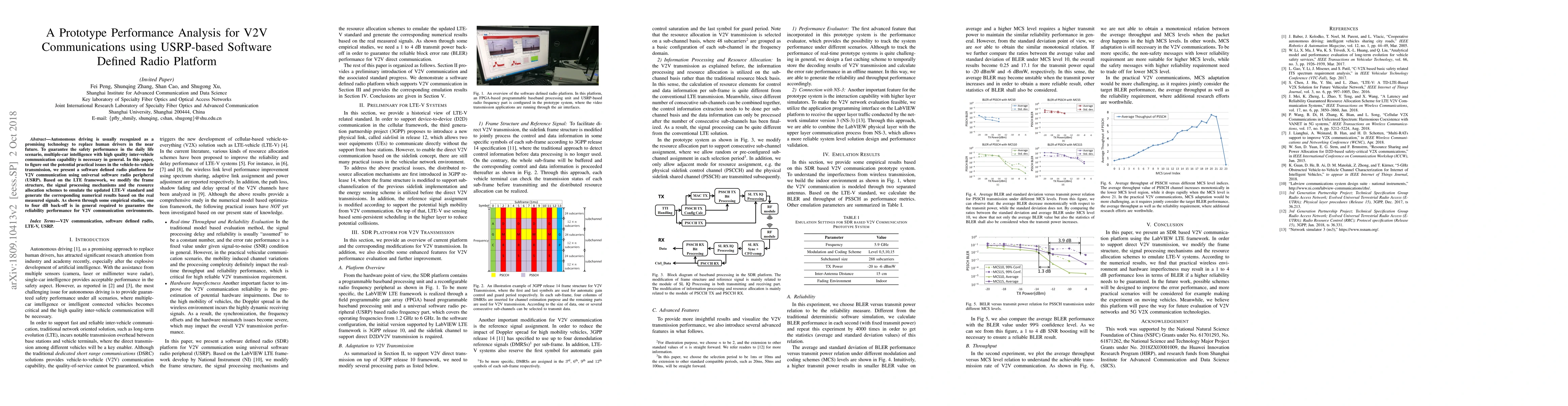 Autonomous driving is usually recognized as a promising technology to replace human drivers in the near future. To guarantee the safety performance in the daily life scenario, multiple-car intelligence with high quality inter-vehicle communication capability is necessary in general. In this paper, to figure out the potential practical issues in the vehicle-to-vehicle transmission, we present a software defined radio platform for V2V communication using universal software radio peripheral (USRP). Based on the LTE framework, we modify the frame structure, the signal processing mechanisms and the resource allocation schemes to emulate the updated LTE-V standard and generate the corresponding numerical results based on the real measured signals. As shown through some empirical studies, one to four dB back-off is in general required to guarantee the reliability performance for V2V communication environments.