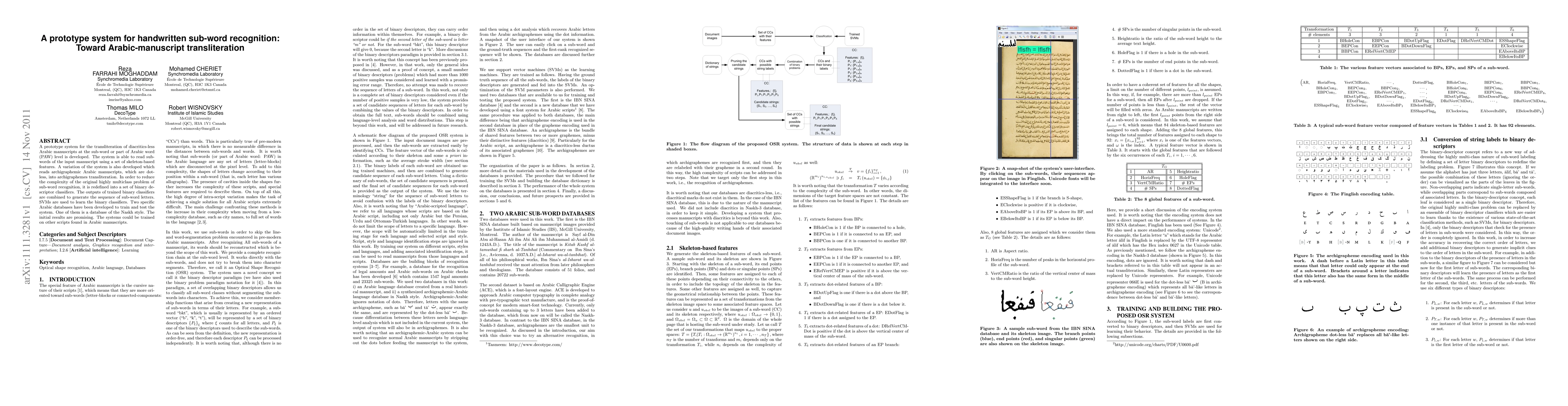 A prototype system for the transliteration of diacritics-less Arabic manuscripts at the sub-word or part of Arabic word (PAW) level is developed. The system is able to read sub-words of the input manuscript using a set of skeleton-based features. A variation of the system is also developed which reads archigraphemic Arabic manuscripts, which are dot-less, into archigraphemes transliteration. In order to reduce the complexity of the original highly multiclass problem of sub-word recognition, it is redefined into a set of binary descriptor classifiers. The outputs of trained binary classifiers are combined to generate the sequence of sub-word letters. SVMs are used to learn the binary classifiers. Two specific Arabic databases have been developed to train and test the system. One of them is a database of the Naskh style. The initial results are promising. The systems could be trained on other scripts found in Arabic manuscripts.