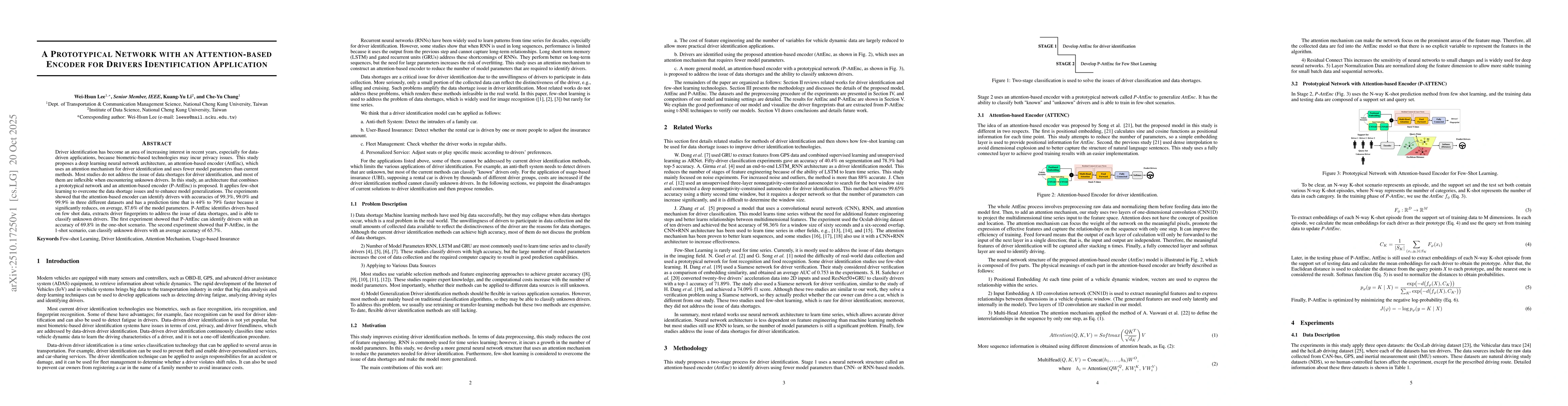 Driver identification has become an area of increasing interest in recent years, especially for data- driven applications, because biometric-based technologies may incur privacy issues. This study proposes a deep learning neural network architecture, an attention-based encoder (AttEnc), which uses an attention mechanism for driver identification and uses fewer model parameters than current methods. Most studies do not address the issue of data shortages for driver identification, and most of them are inflexible when encountering unknown drivers. In this study, an architecture that combines a prototypical network and an attention-based encoder (P-AttEnc) is proposed. It applies few-shot learning to overcome the data shortage issues and to enhance model generalizations. The experiments showed that the attention-based encoder can identify drivers with accuracies of 99.3%, 99.0% and 99.9% in three different datasets and has a prediction time that is 44% to 79% faster because it significantly reduces, on average, 87.6% of the model parameters. P-AttEnc identifies drivers based on few shot data, extracts driver fingerprints to address the issue of data shortages, and is able to classify unknown drivers. The first experiment showed that P-AttEnc can identify drivers with an accuracy of 69.8% in the one-shot scenario. The second experiment showed that P-AttEnc, in the 1-shot scenario, can classify unknown drivers with an average accuracy of 65.7%.