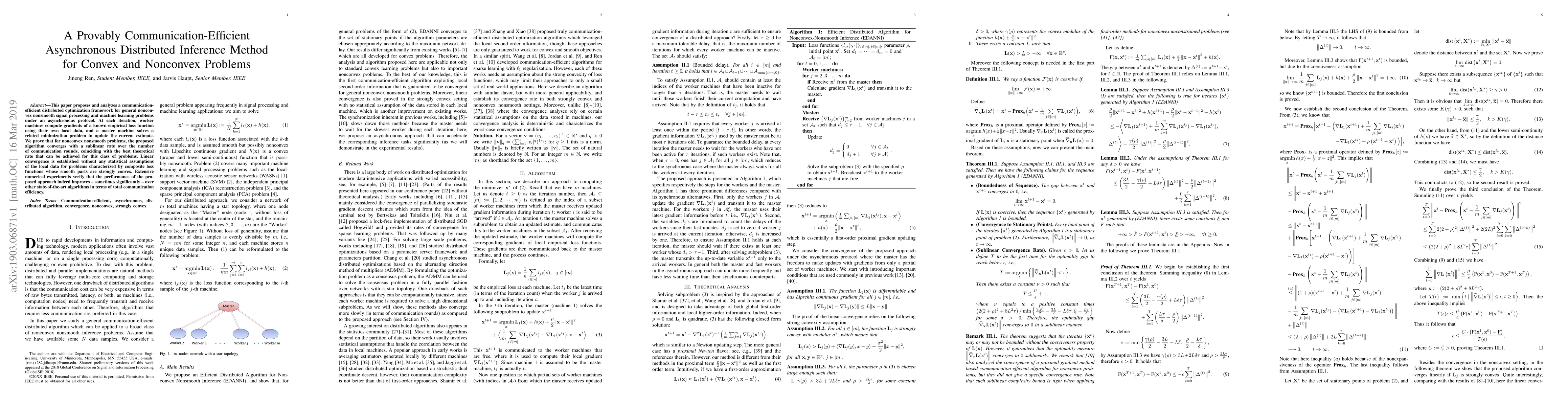 This paper proposes and analyzes a communication-efficient distributed optimization framework for general nonconvex nonsmooth signal processing and machine learning problems under an asynchronous protocol. At each iteration, worker machines compute gradients of a known empirical loss function using their own local data, and a master machine solves a related minimization problem to update the current estimate. We prove that for nonconvex nonsmooth problems, the proposed algorithm converges with a sublinear rate over the number of communication rounds, coinciding with the best theoretical rate that can be achieved for this class of problems. Linear convergence is established without any statistical assumptions of the local data for problems characterized by composite loss functions whose smooth parts are strongly convex. Extensive numerical experiments verify that the performance of the proposed approach indeed improves -- sometimes significantly -- over other state-of-the-art algorithms in terms of total communication efficiency.